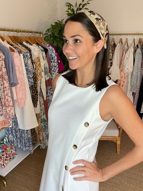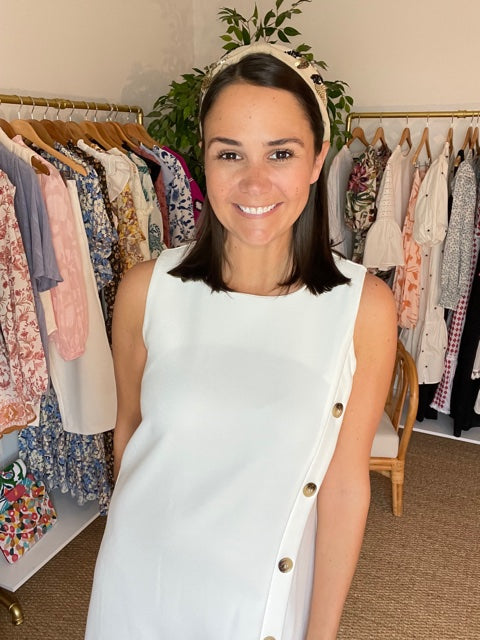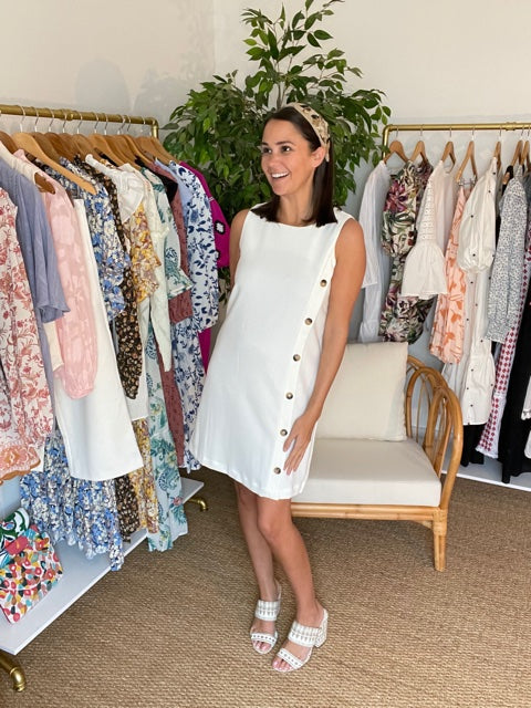 White, sleeveless, knee length dress with horn button detail in heavy cotton.