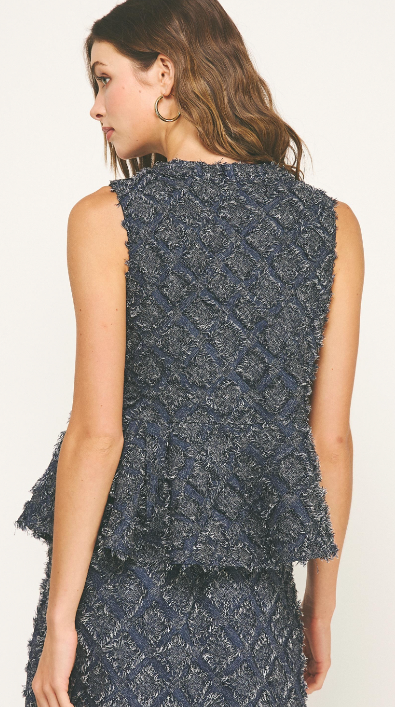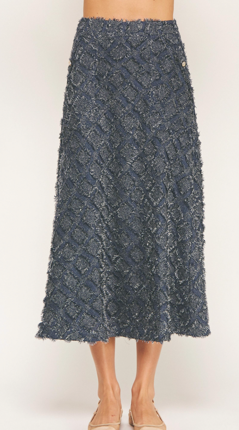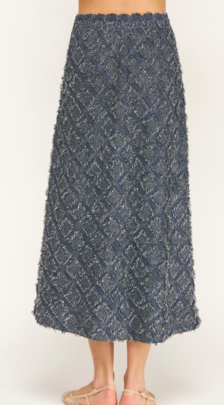 Navy fringe pattern skirt set. Cotton poly blend and lined.