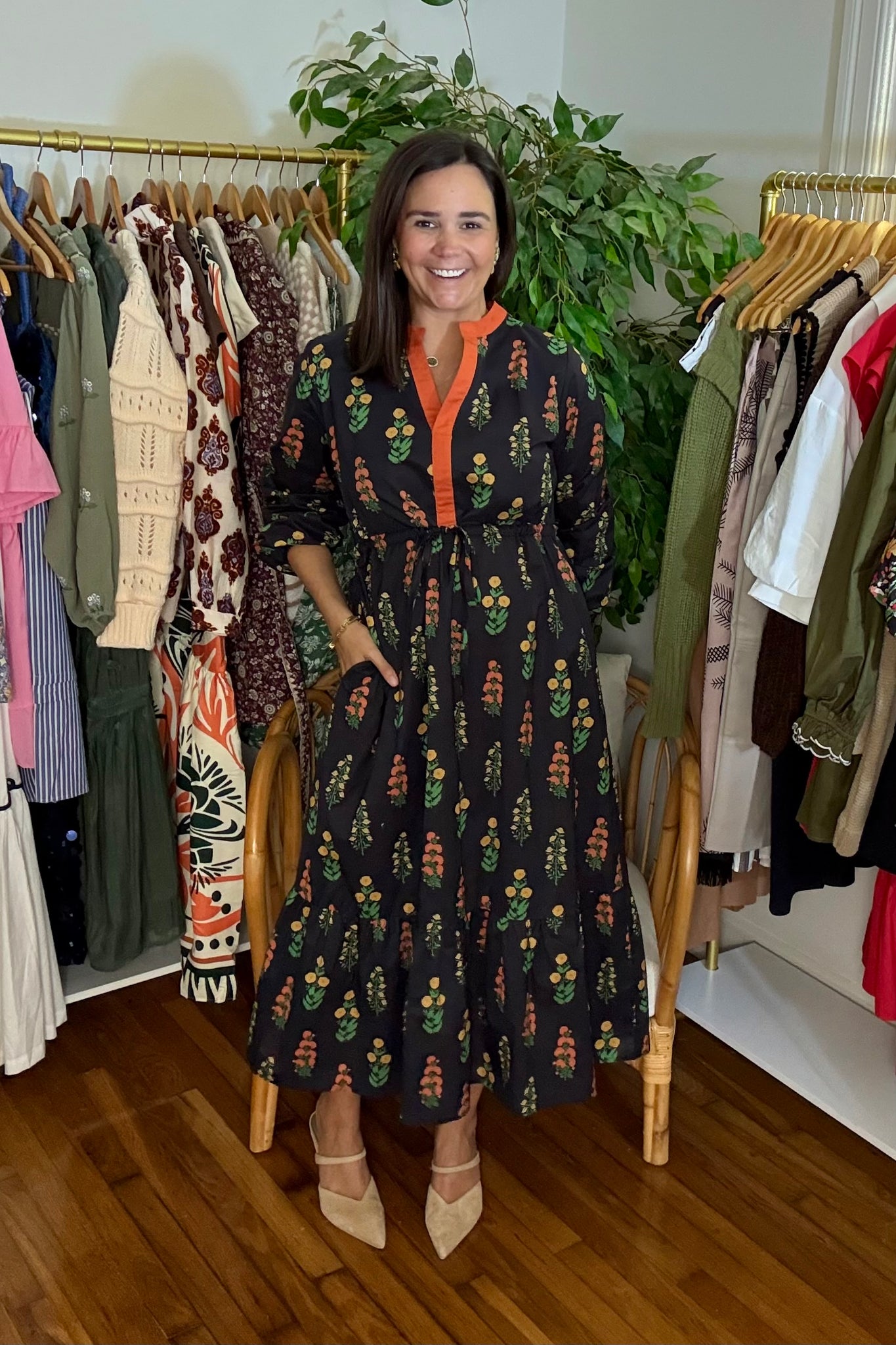 Black midi dress with block print, colorful floral pattern, contrasting neckline and drawstring empire waistline. Gathered skirt with pockets. Cotton and lined.