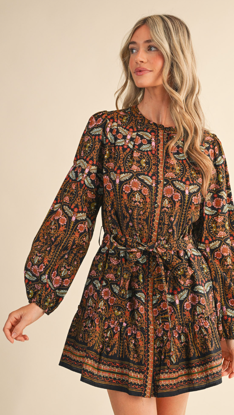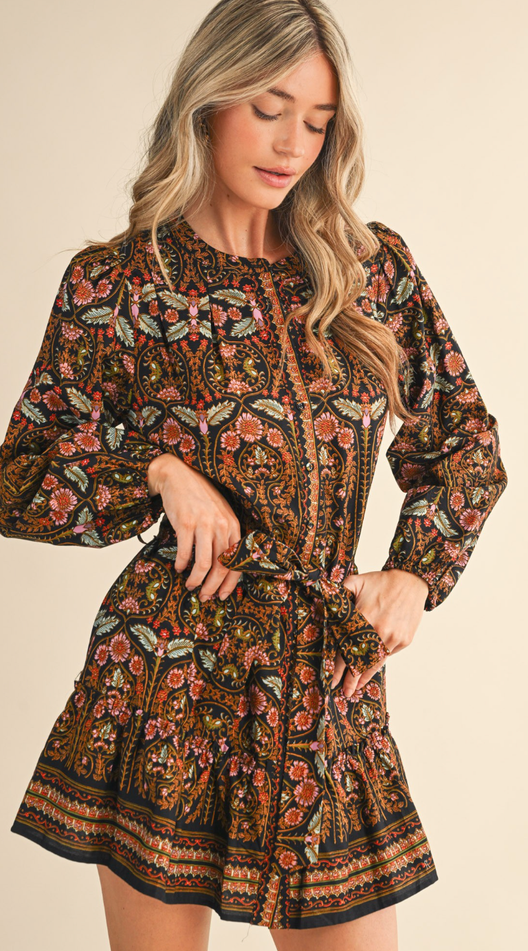 Black and multi color printed floral mini dress. Full button down, pockets, gathered skirt with contrasting hemline. Long sleeves with elastic wrist for sleeve length placements and removable sash at waistline. Cotton and lined.