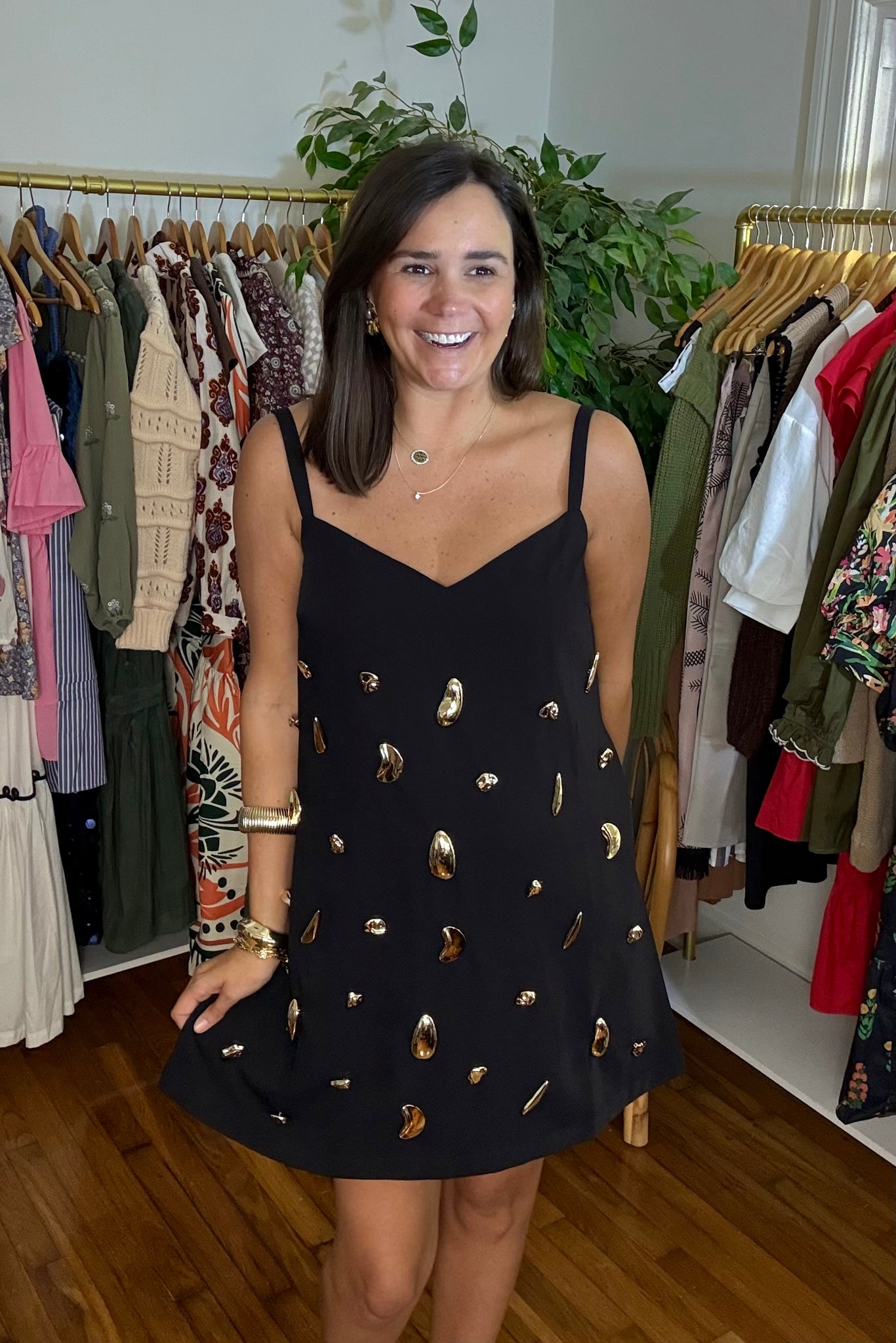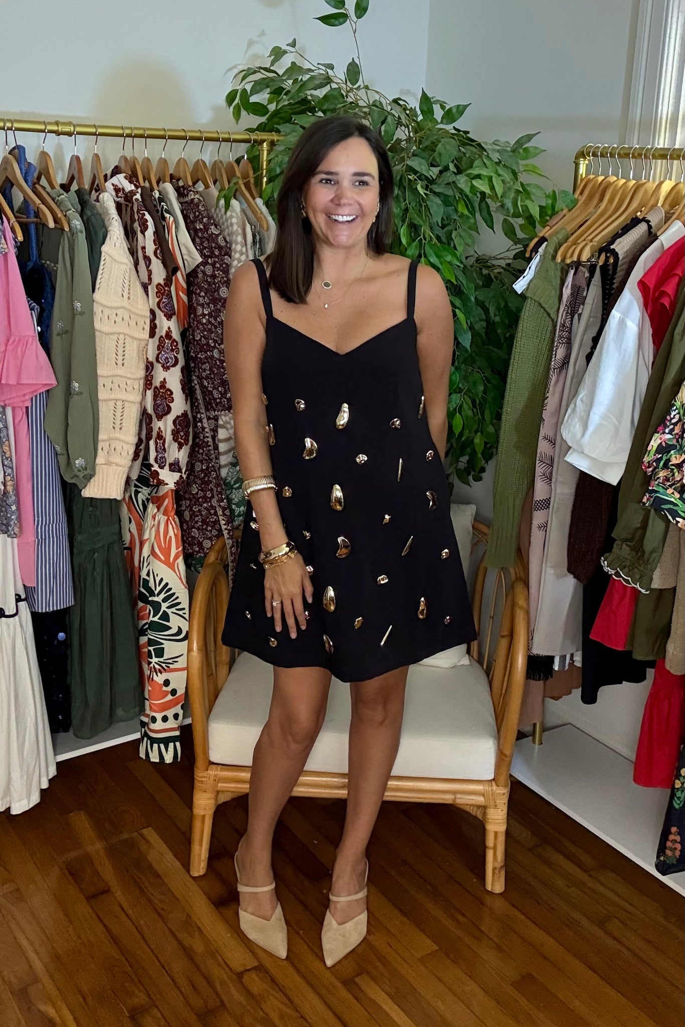 Black shift dress with slight v-neckline and skinny straps. Boxy shift style with pockets. Oversized gold statement Holiday beads. No beads on backside and back zipper closure. Poly silk blend.