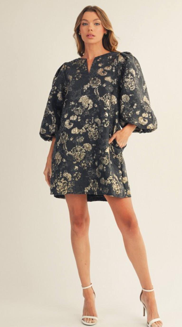 Jacquard mini dress with oversized puff sleeves. Spit neckline and shift style silhouette. Black with champagne print. Straight shift with pockets.