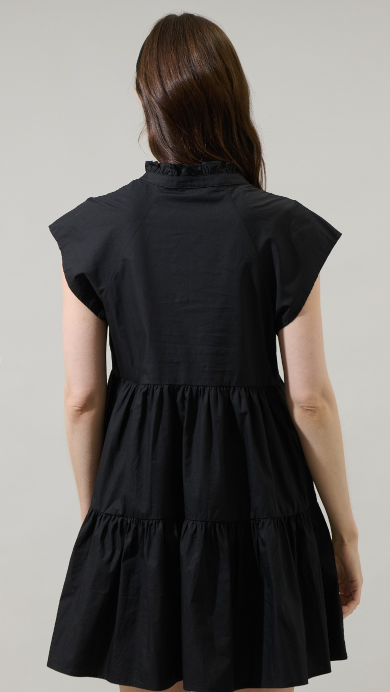 Janelly tiered mini dress. Flutter sleeves, ruffle detail on neckline and tiered skirt with pockets. Cotton poplin and lined.
