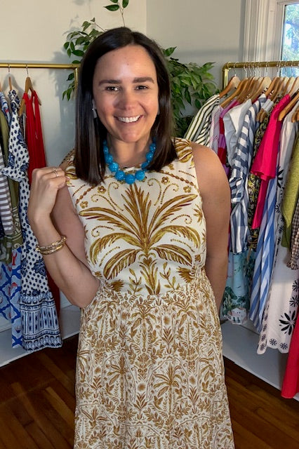 Calina tropical jive print in cream, brown and mustard. Light weight cotton and lined maxi dress. Empire elastic waistline and back zipper closure. Tiered maxi skirt with pockets.