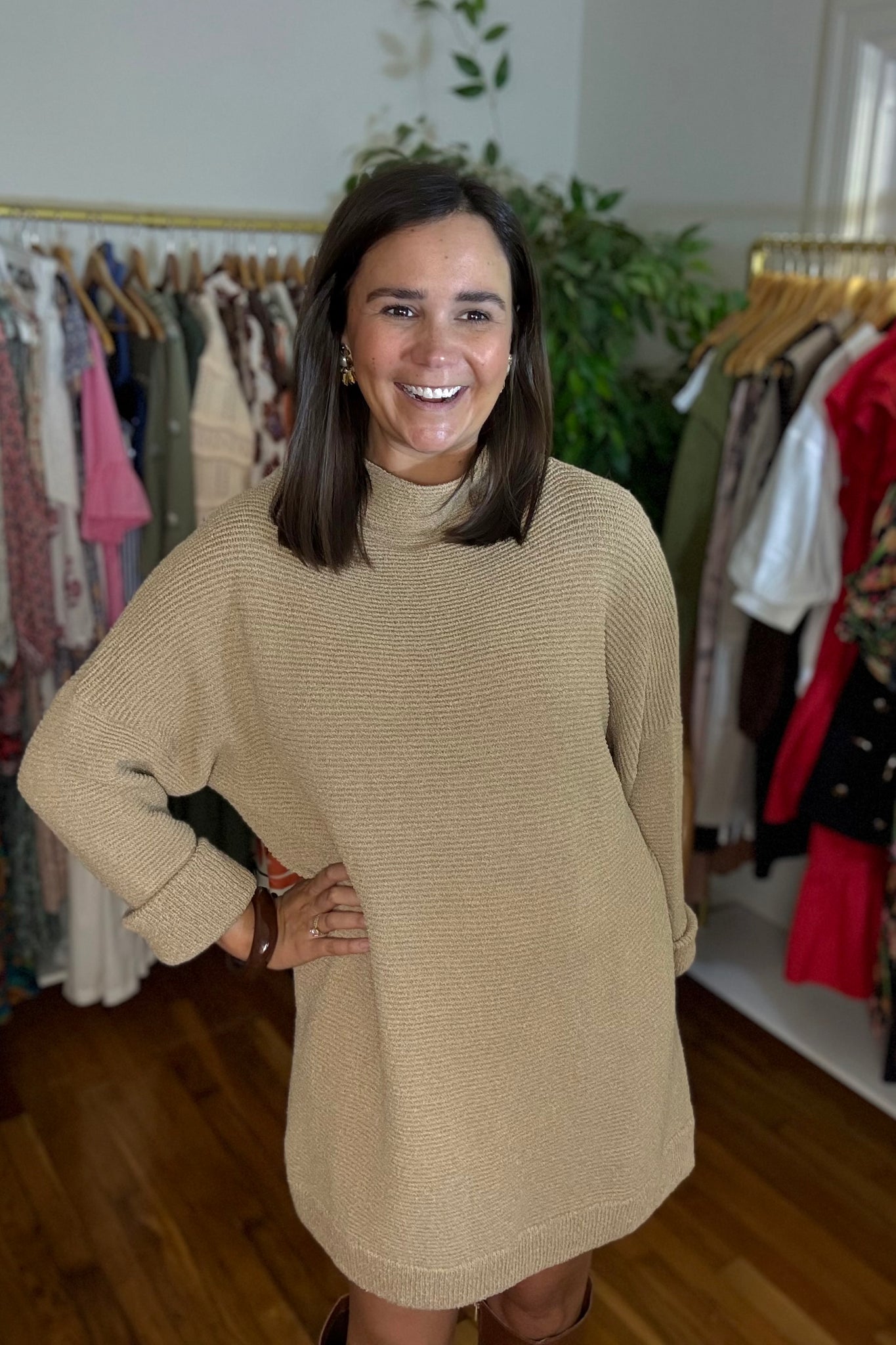 Mocha sweater dress with mock collar, long sleeves and drop shoulder. Cotton poly blend with stretch.