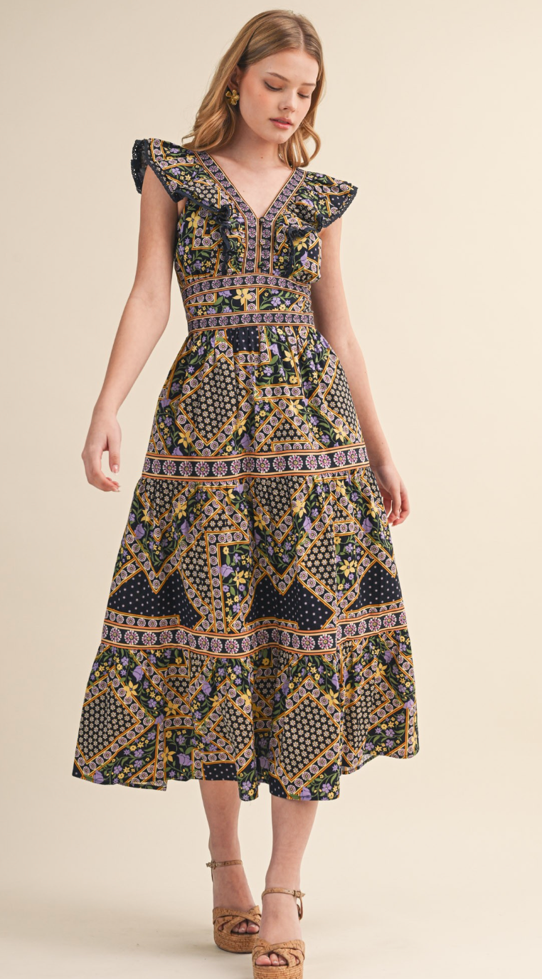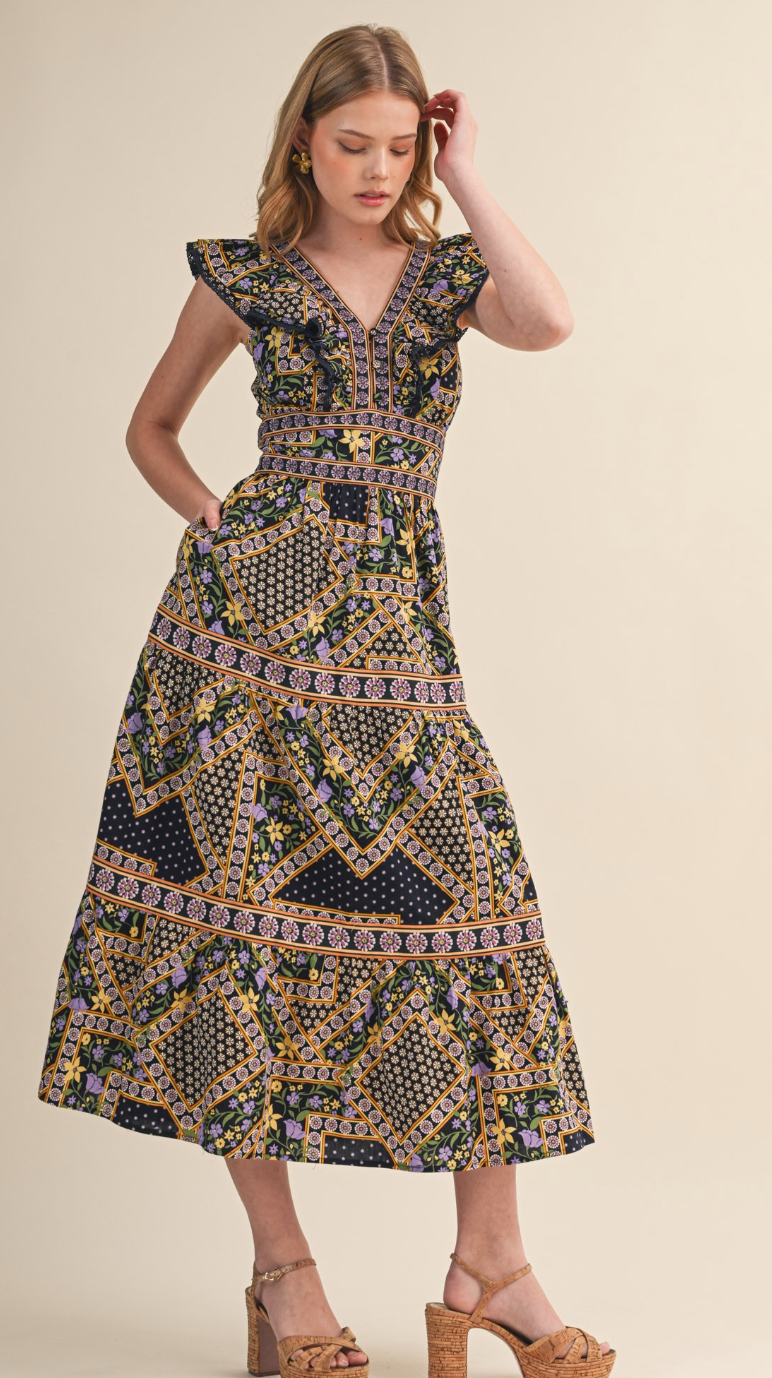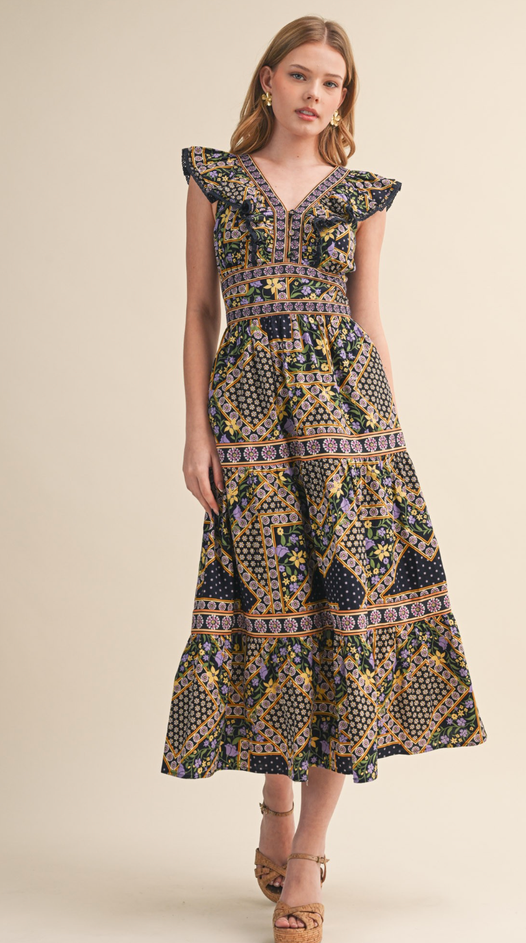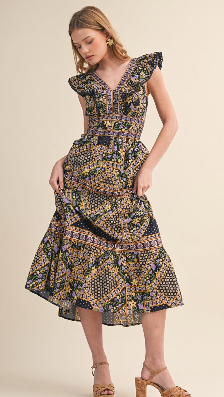 Deep navy midi dress with lavender and chartreuse printed pattern. Ruffle v-neck detailing with swiss-dot trim. Functional front buttons, smocked backing for adjustable fit. Empire waist, tiered skirt with contrasting design. Cotton and lined.
