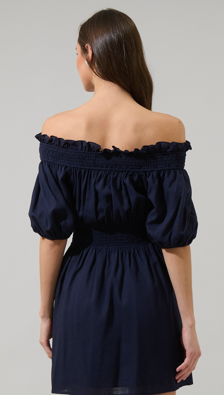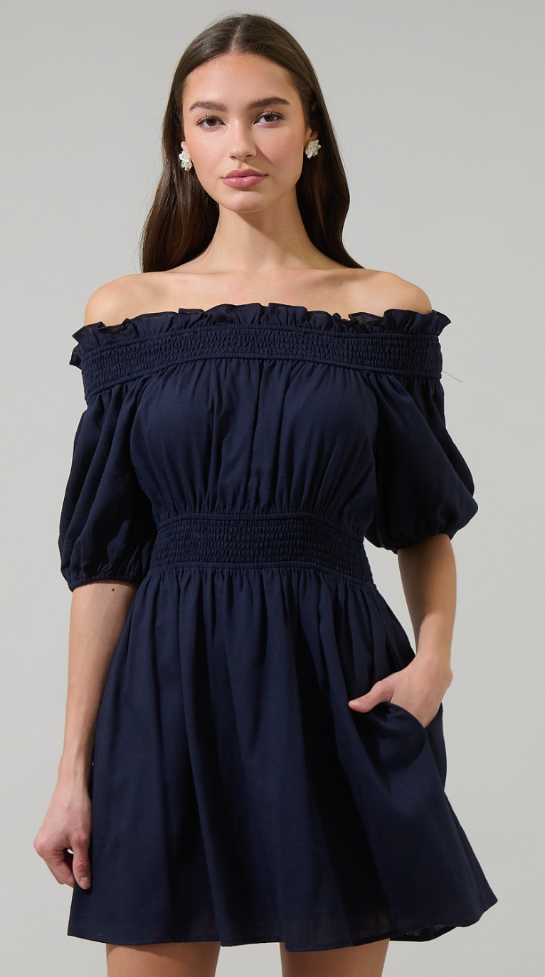 Sairy mini dress in navy. Off shoulder neckline with ruffle detailing. Elastic sleeves for adjustable placement, smocked waistline and straight skirt with pockets. Heavy linen and lined.
