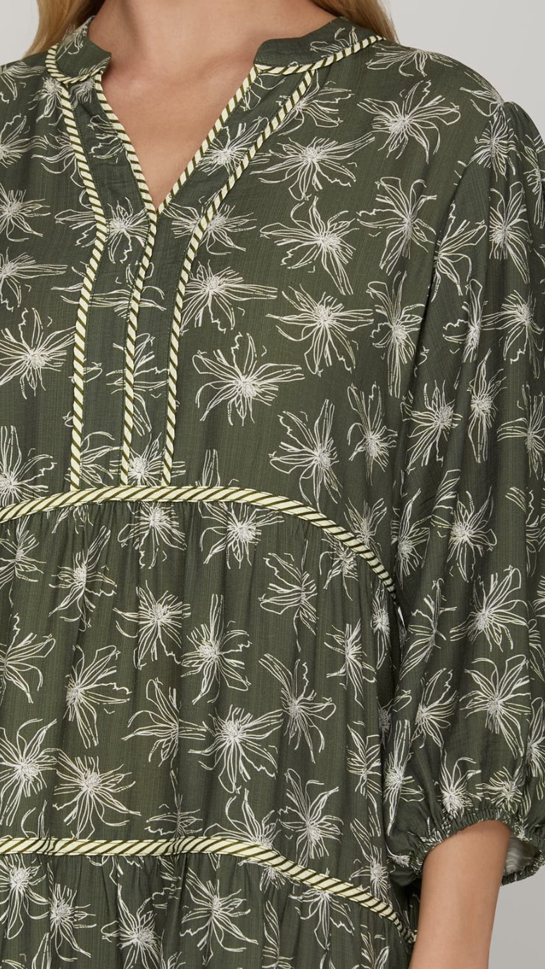 Olive tiered midi dress. Split neckline and three quarter sleeves with elastic cuffs for adjustable placement. Tiered skirt with pockets and olive striped piping detail through out. Crinkle cotton poly blend.