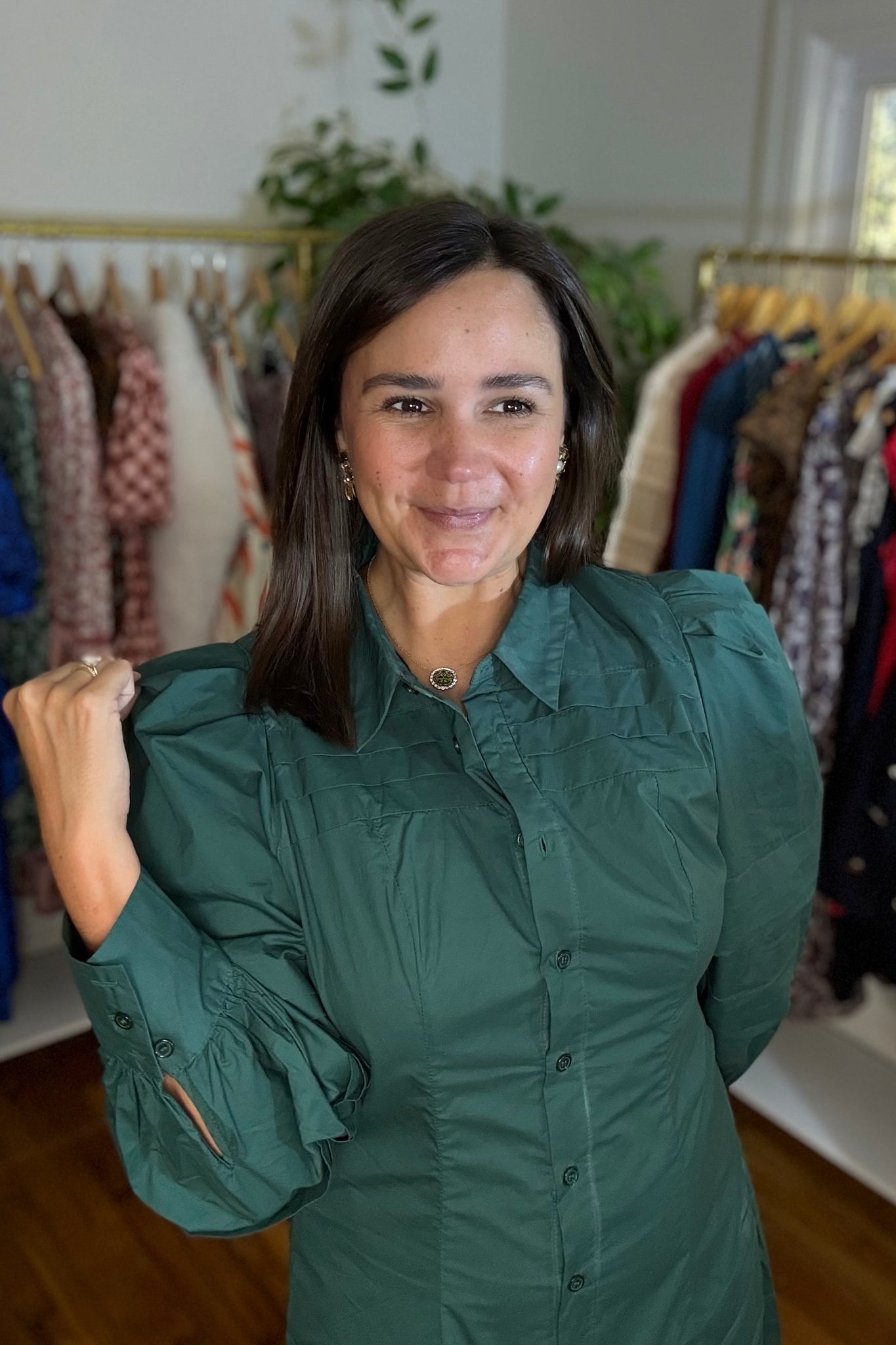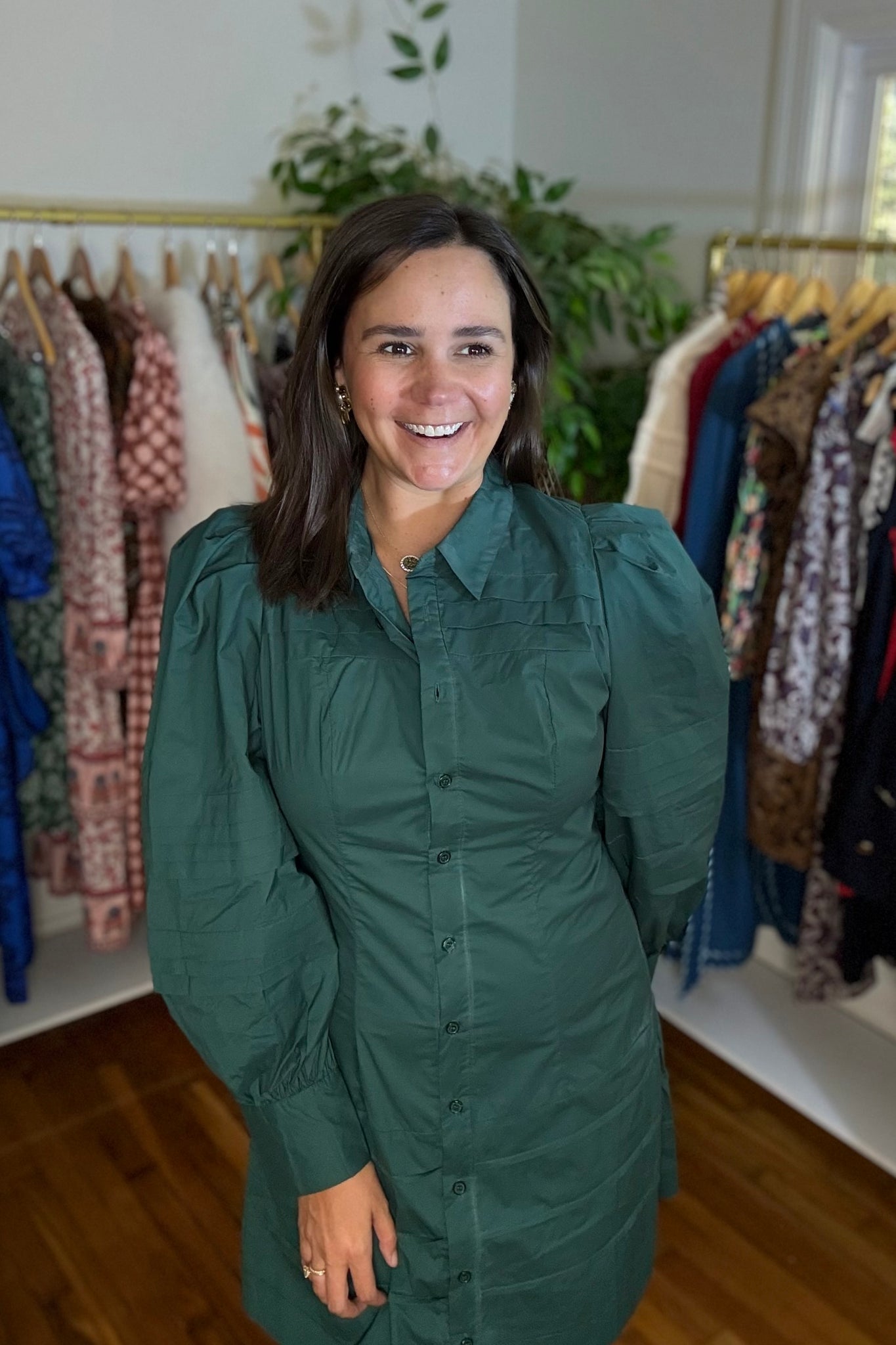 Warn army green, cotton poplin, mini dress. Functional front buttons and collar. Fitted with dramatic balloon sleeves. Double-triple pleat detailing on sleeves, puff shoulders and triple pleat on bodice and skirt.