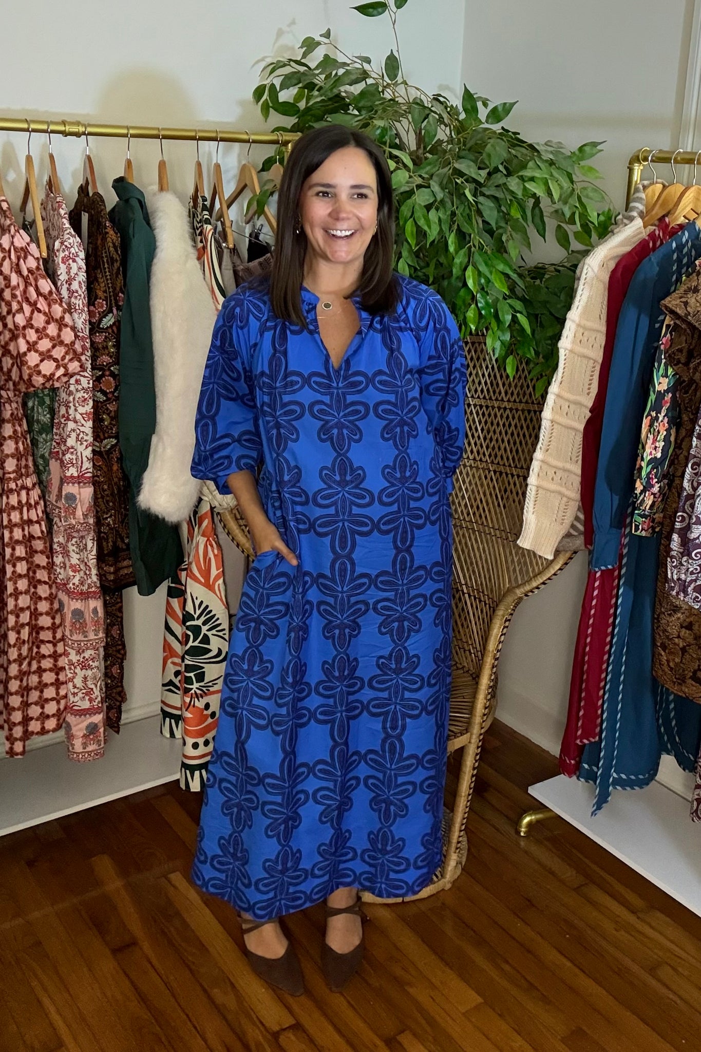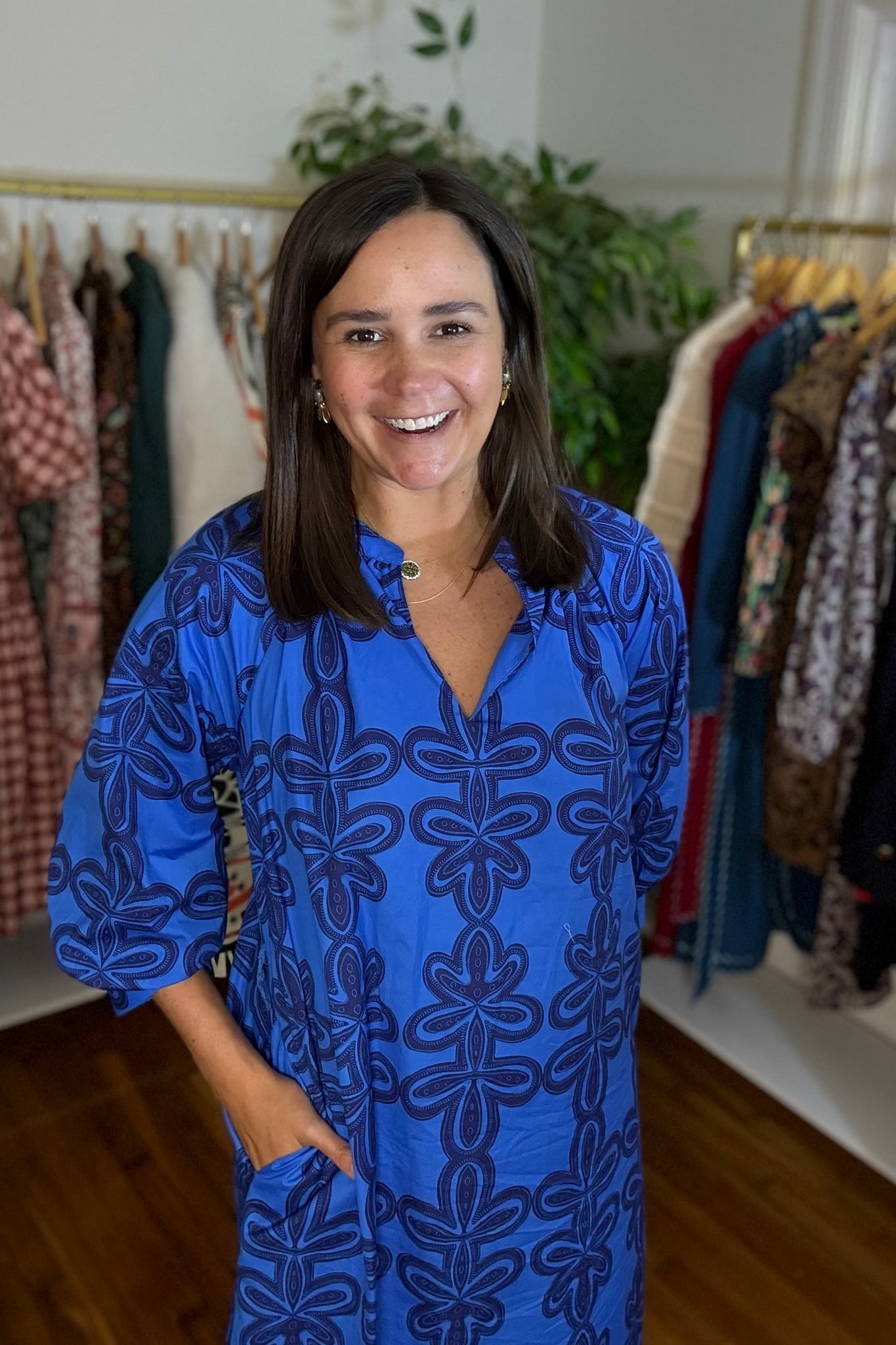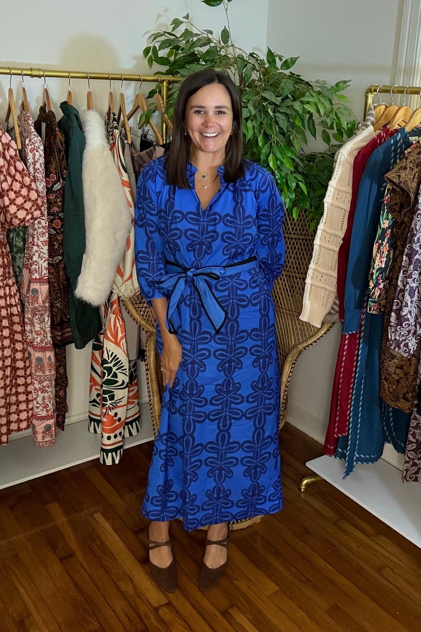 Romery Midi Dress in abstract Teri print. Split neck with gathered shoulders. Three quarter length, pockets and straight midi length skirt with removable sash at waistline. Cotton.