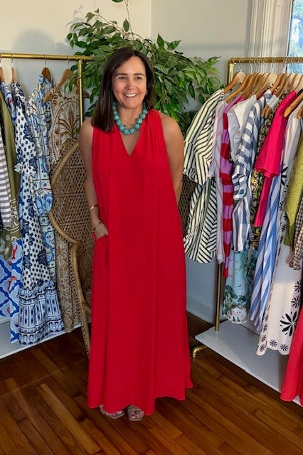 Rubi red halter maxi dress. modest v-neck and back halter-razor backside. Straight oversized body with pockets. Linen and lined.