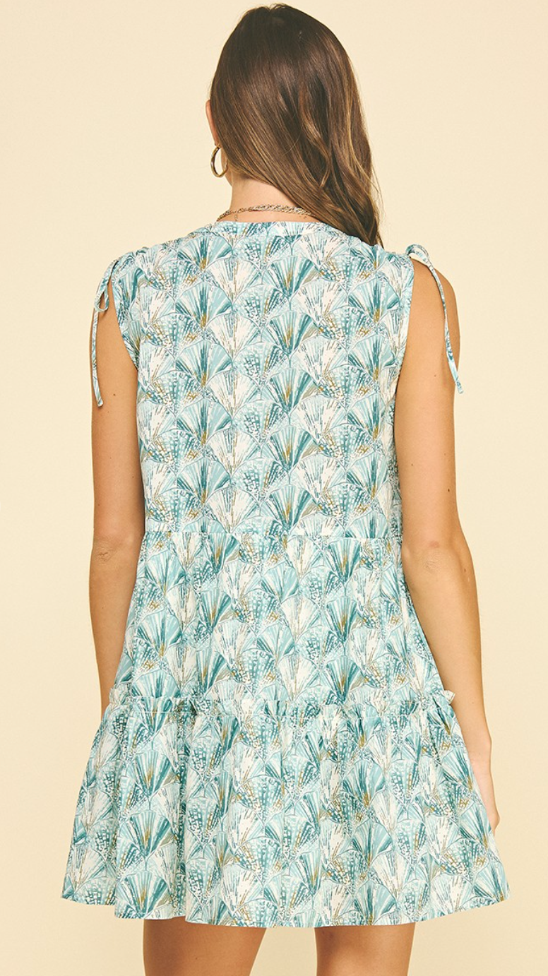 Shift style mini dress with teal multi printed seashell print. Drop waist with ruffle detailing, functional front buttons and faux ties at shoulder. Extremely light weight cotton and lined.