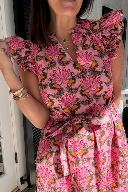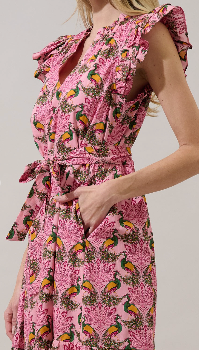 Sita ruffle midi dress in peacock bay print. Ruffle flutter sleeve, split neckline and removable tie at waistline. Straight skirt with pockets and drop hemline.