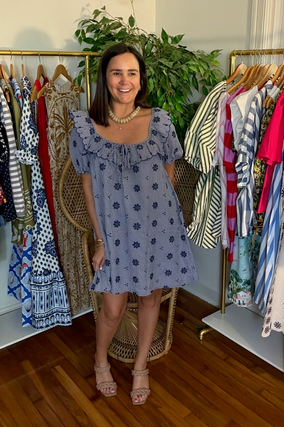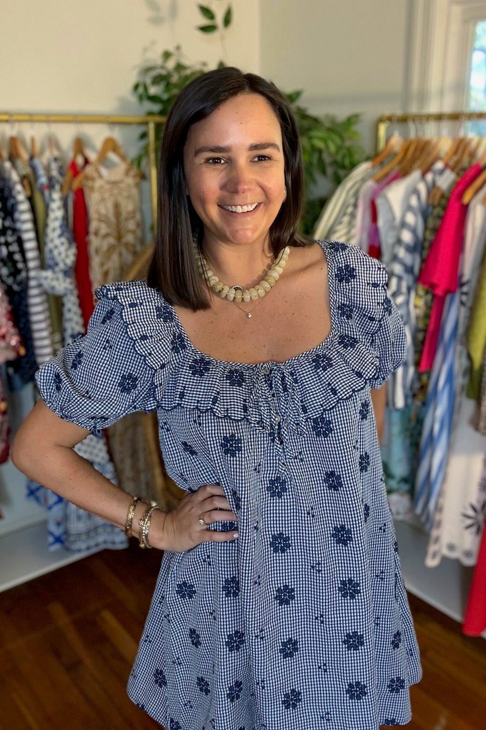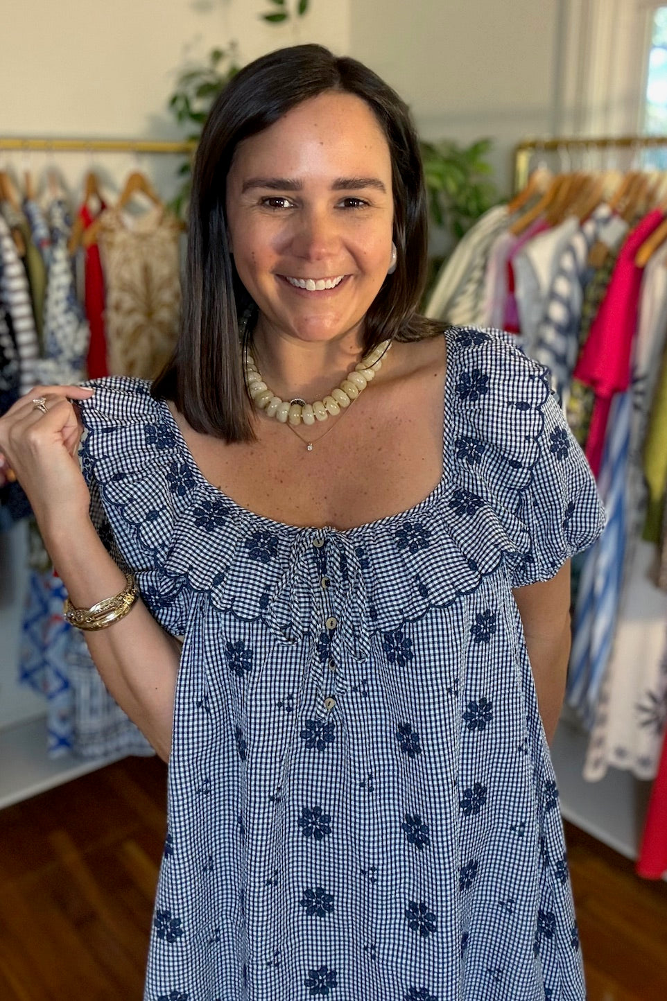 Navy and white gingham mini dress with ruffle neckline and back tie closure. Puff sleeves and babydoll shift. Cotton.