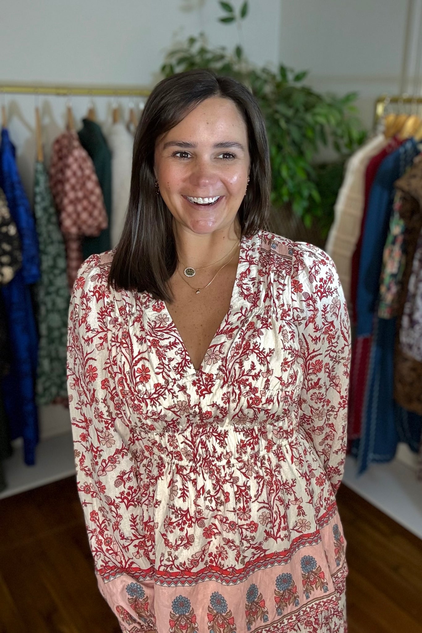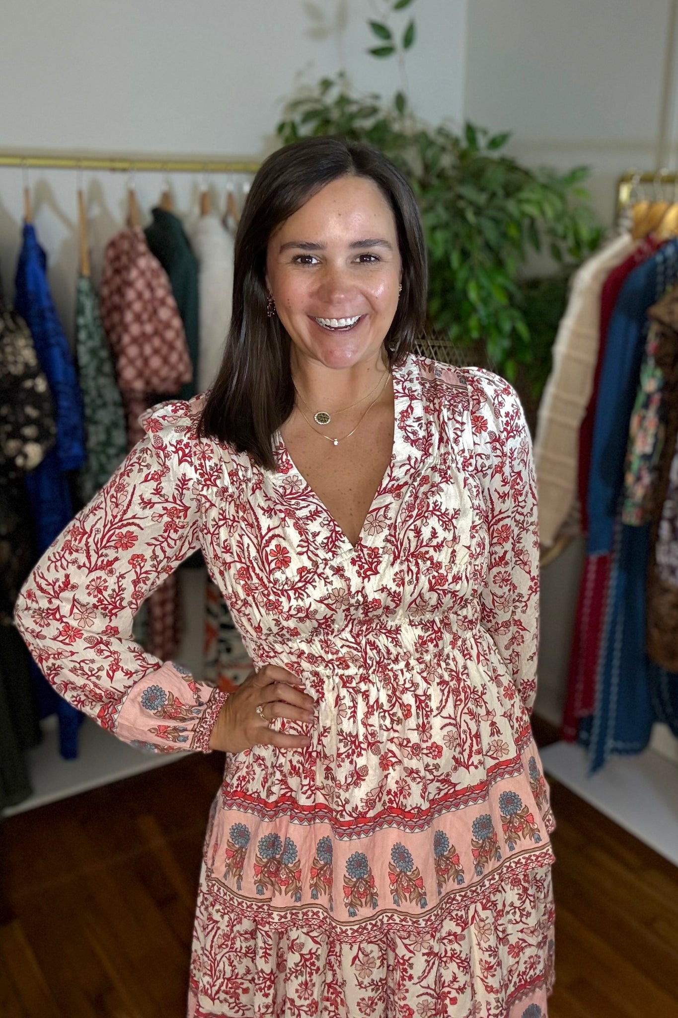 V-Neck maxi dress with long sleeves with elastic wrists for sleeve length placement. Smocked empire waistline with puff shoulders. Tiered skirt with contrasting block print pattern. Cotton blend.