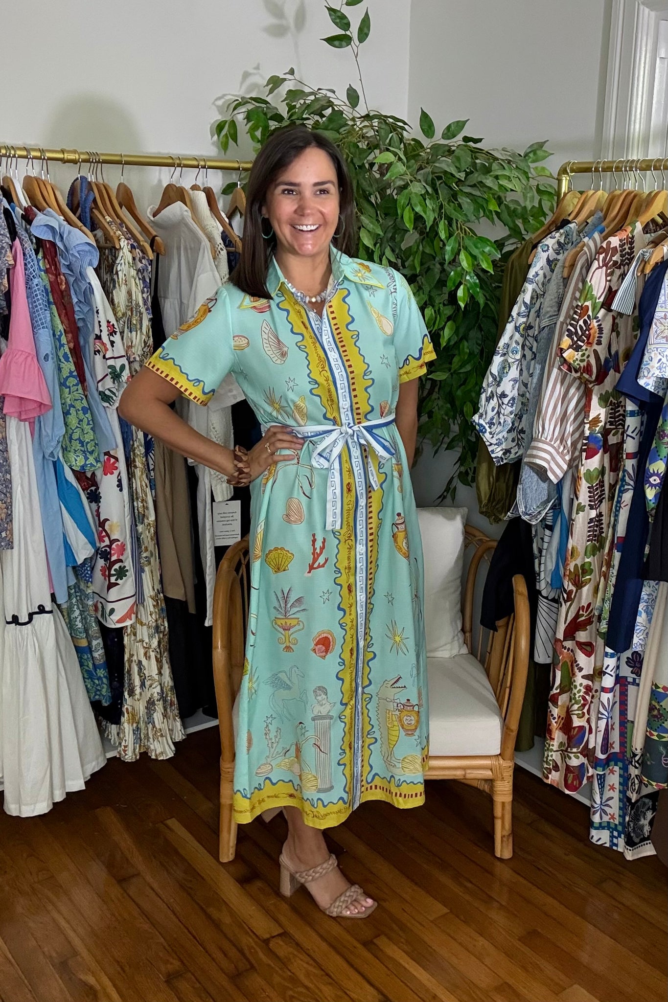 Turquoise jeweled button down dress. Collared shirt dress with functional front buttons and removable tie at waist. Linen poly blend.