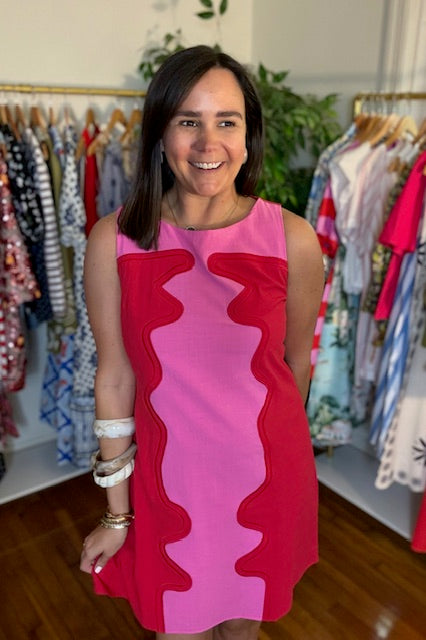 Hot pink linen shift dress with red wave design. Back zipper closure. Linen blend.