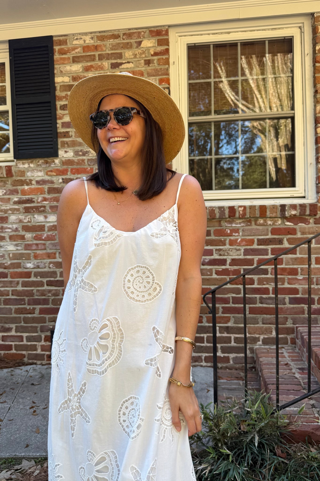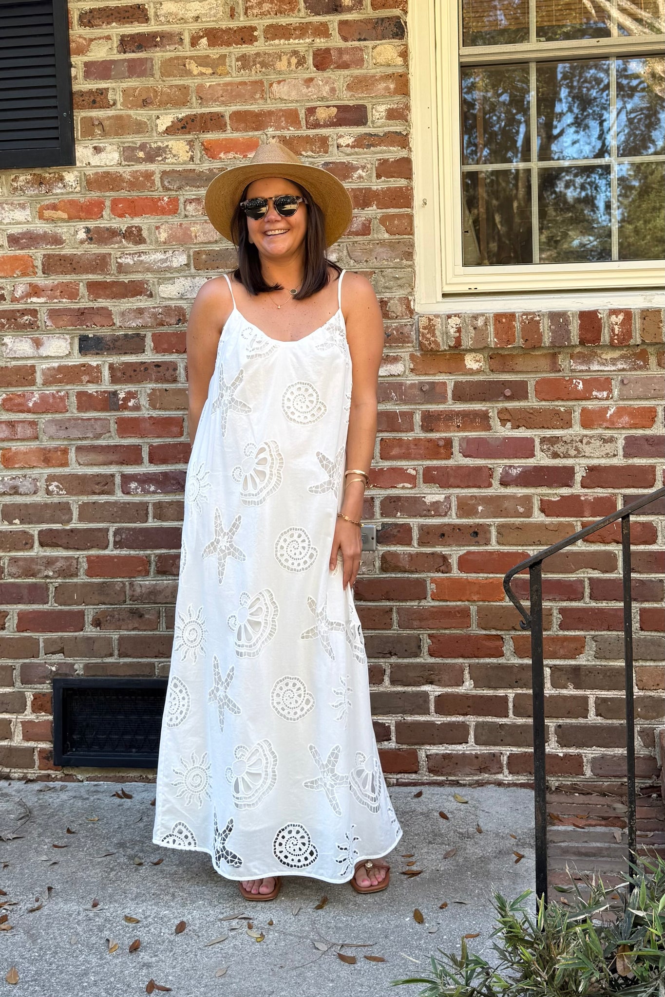 Eyelet coastal sea life maxi dress. Slight v-neck, adjustable tie straps with tassel detailing. Straight shift style, extremely light weight cotton and lined.