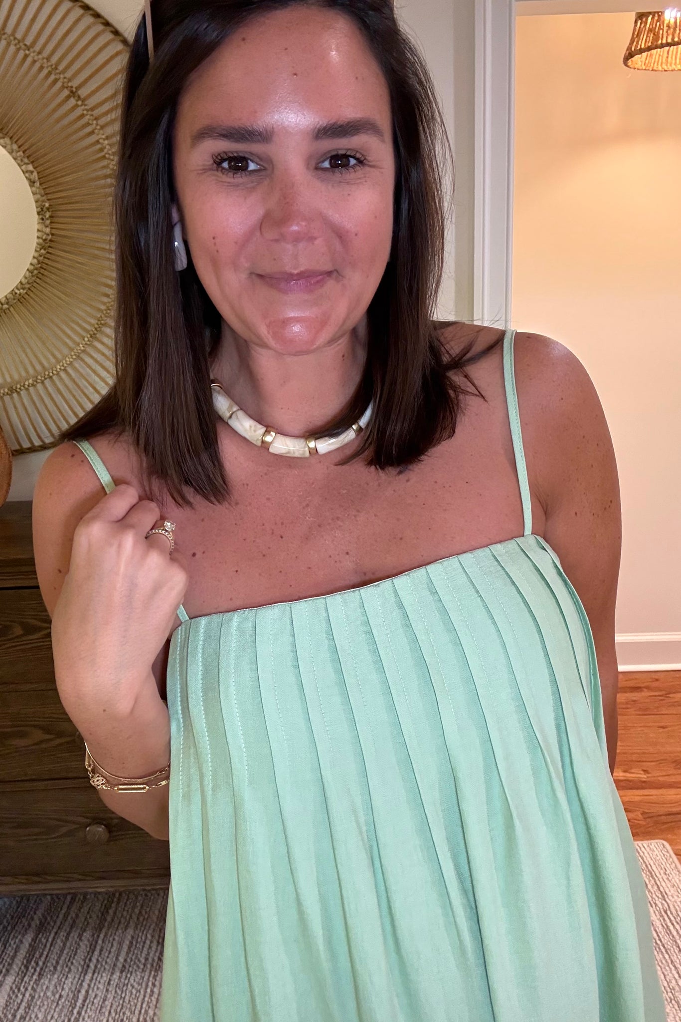 Mint green linen maxi dress. Pleated squared off bodice, elastic neckline for adjustable fit and adjustable straps. Linen and lined. Straight skirt with pockets. True maxi.