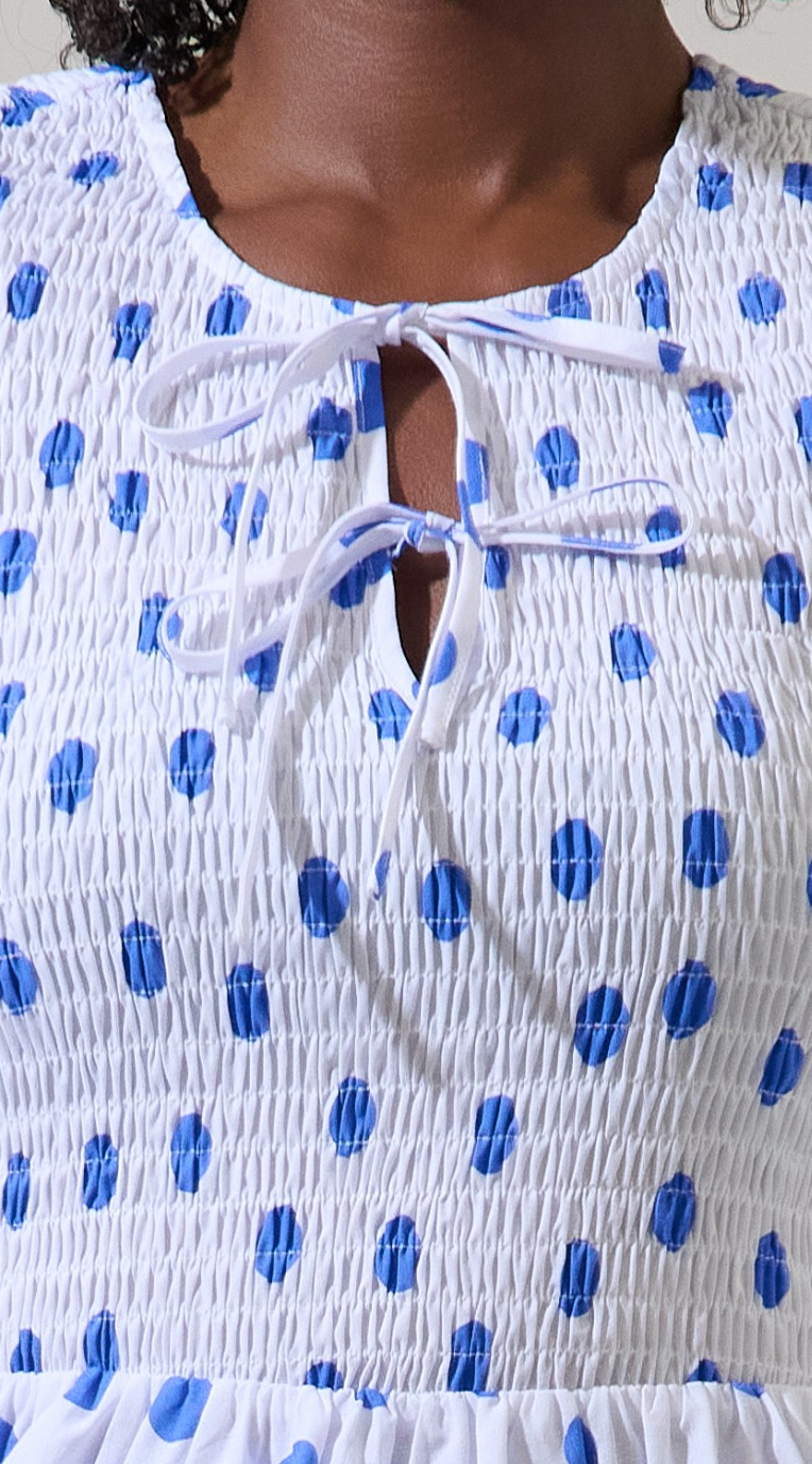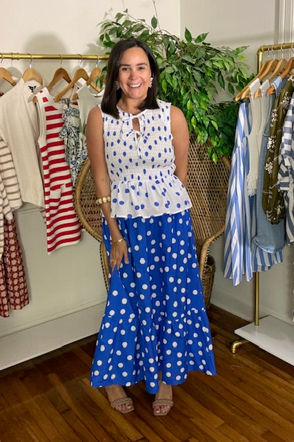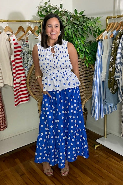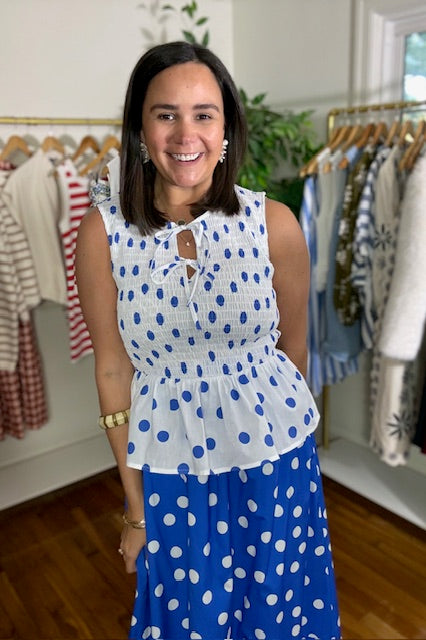 Peplum, sleeveless blouse with double front tie closure. Smocked bodice and cotton poplin peplum hemline.
