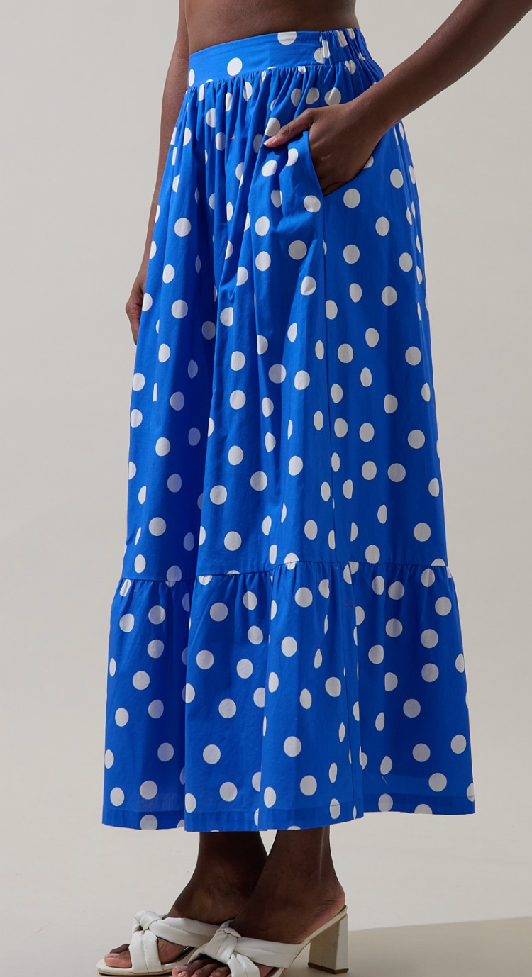 High waisted maxi skirt. Gathered with back elastic waistline. Straight skirt with pockets and drop hemline.