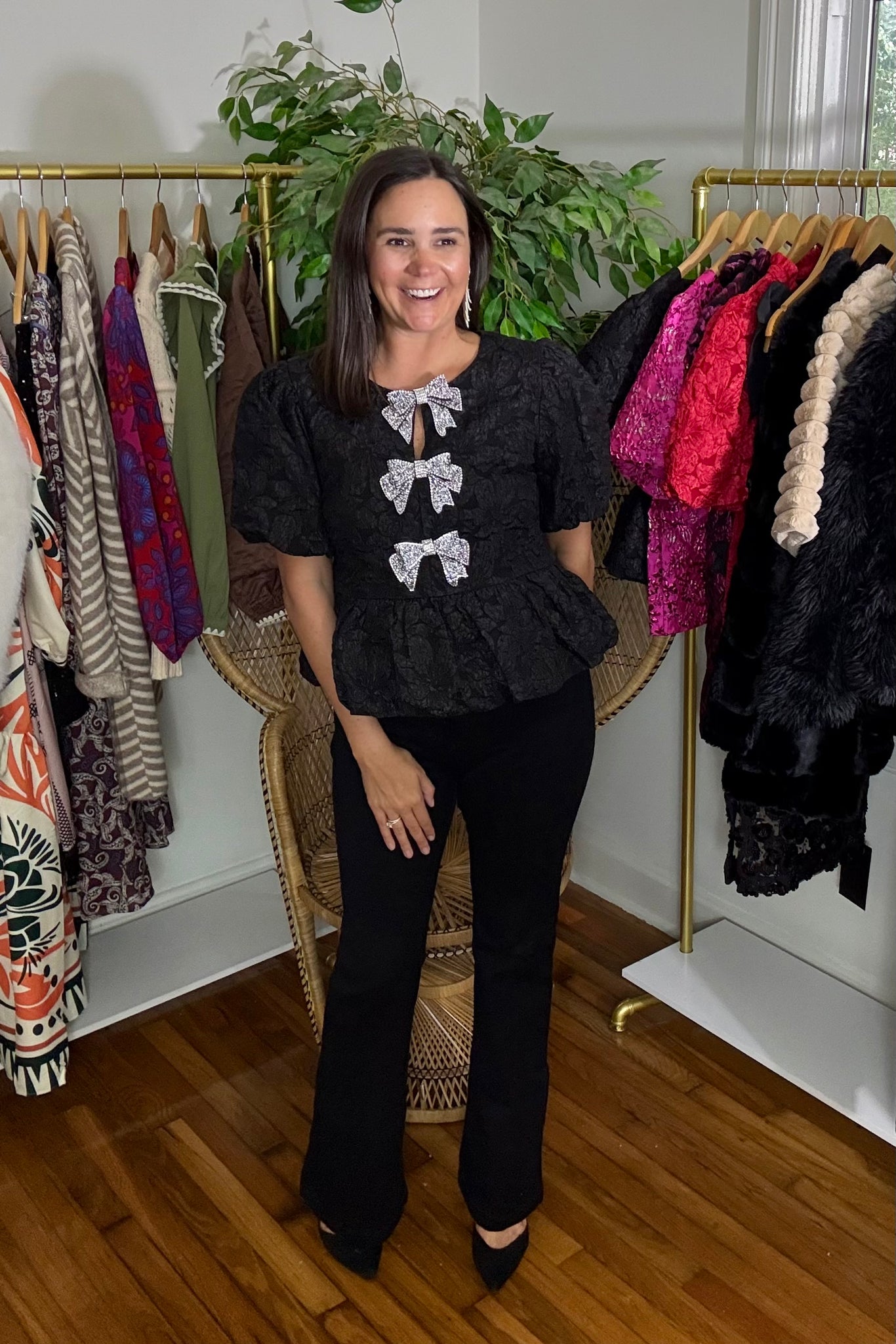 Black jacquard blouse with three rhinestone bow embellishments. Keyhole detailing at top bow, puff sleeves and a peplum waistline.