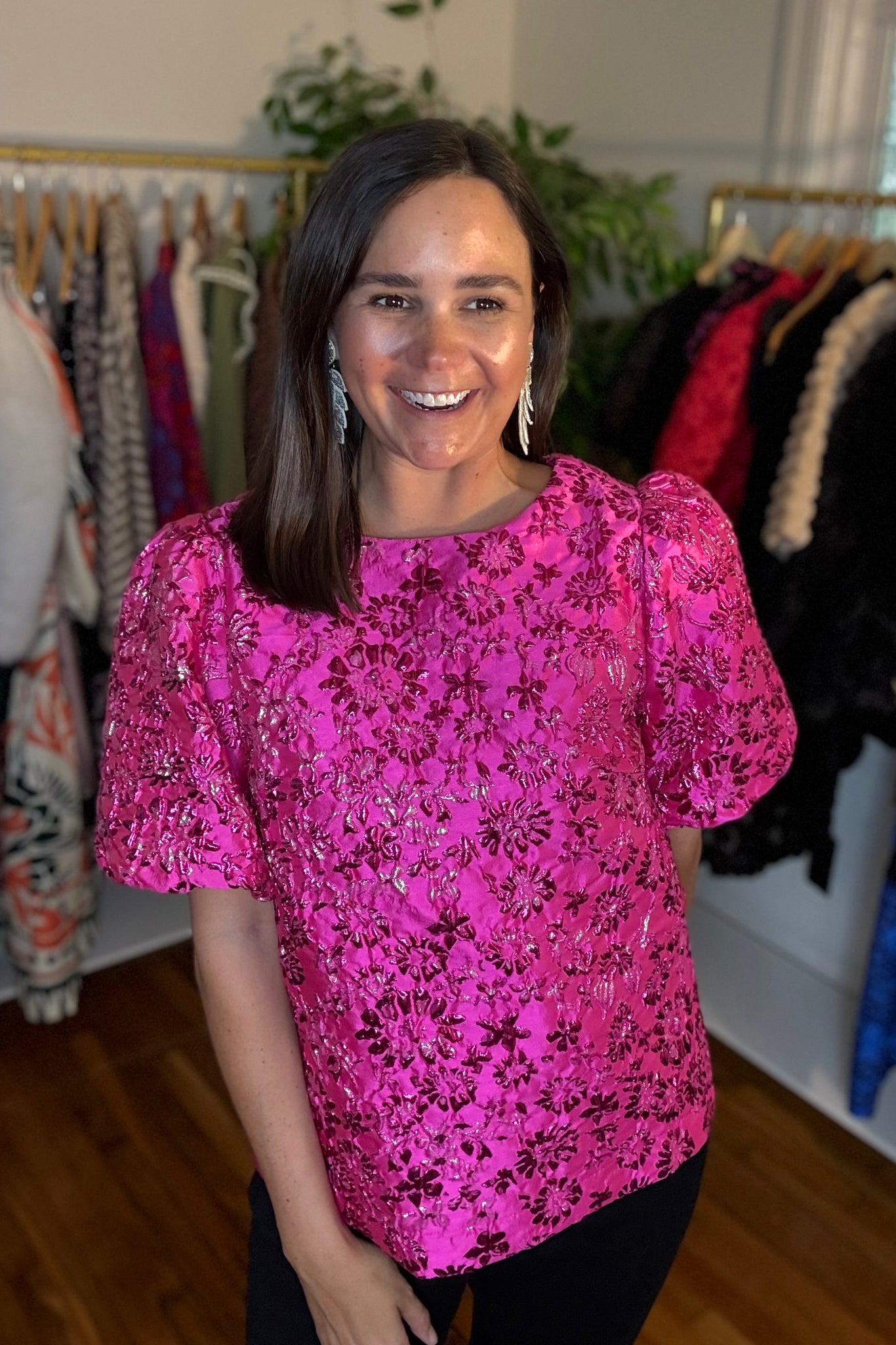Pink and silver jacquard textured blouse with puff sleeves and straight box fit. Back button, keyhole closure. Lined.