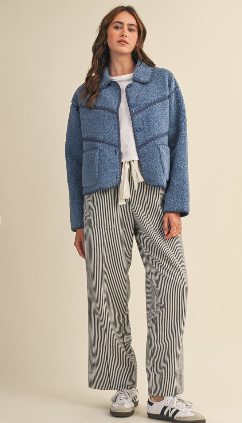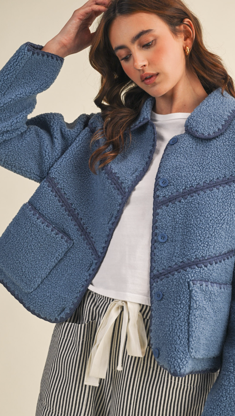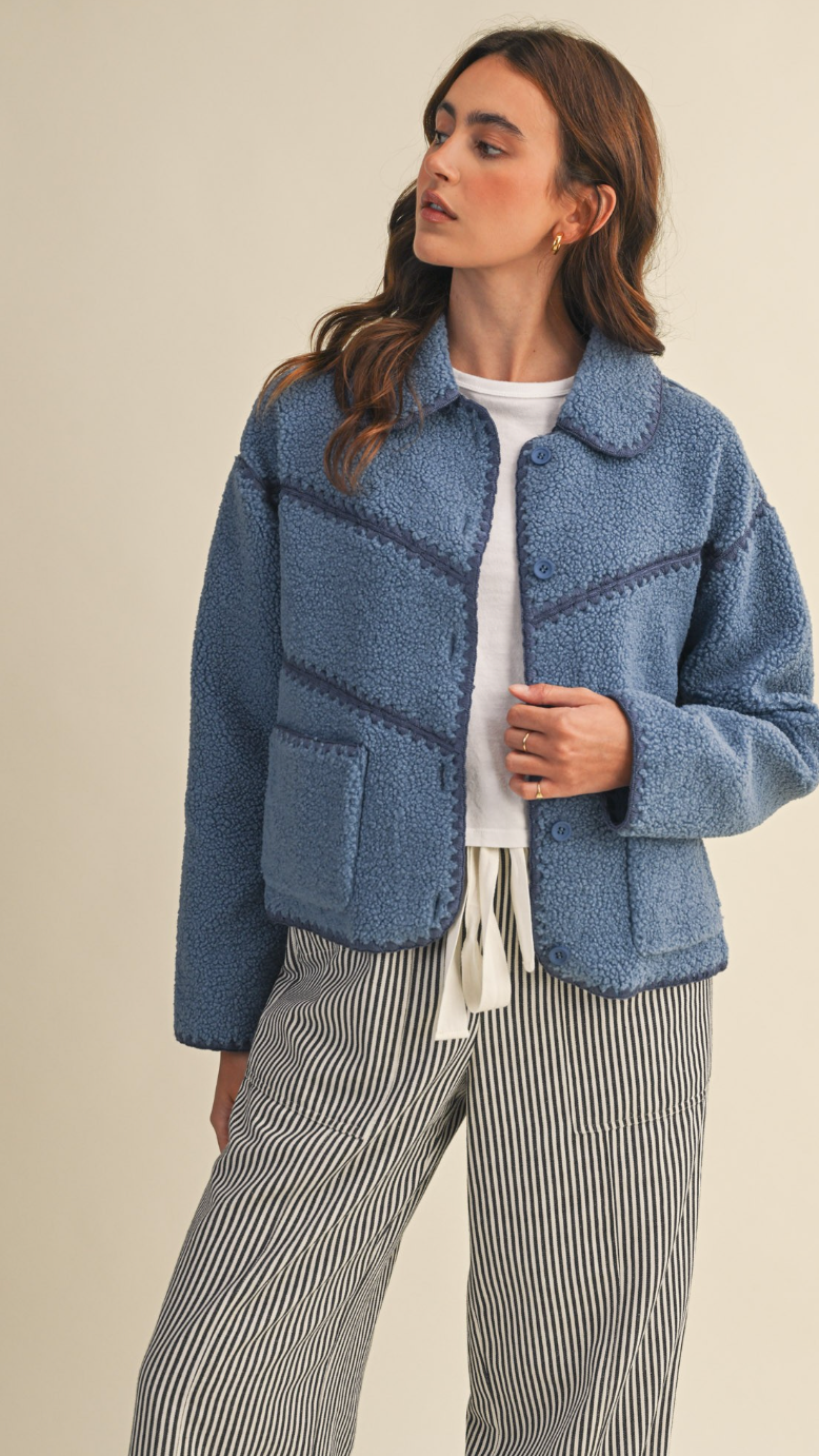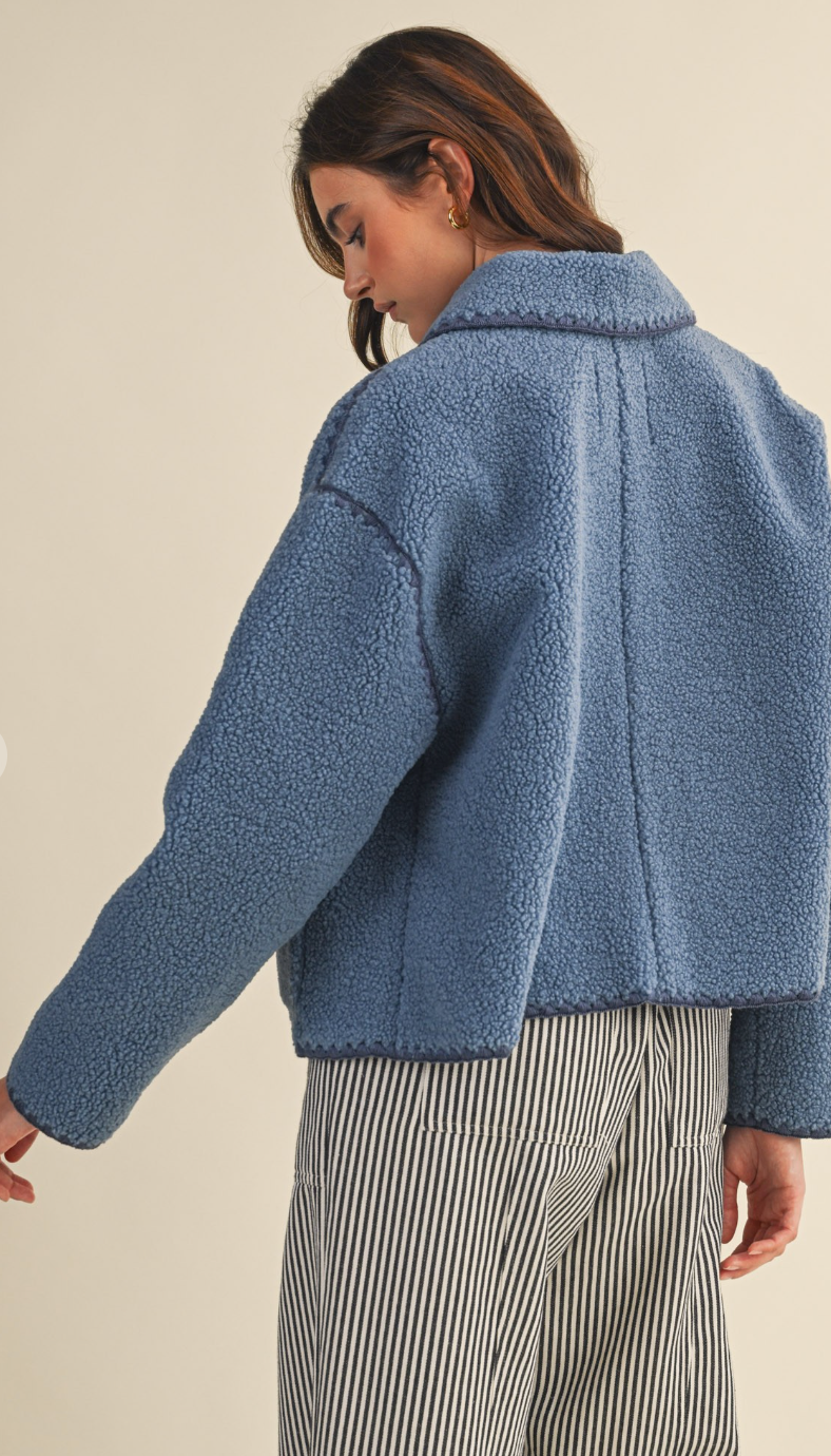 Denim blue fleece jacket. Boxed, cropped fit with dark navy stitching detailing on trims and front pockets. Functional front buttons.