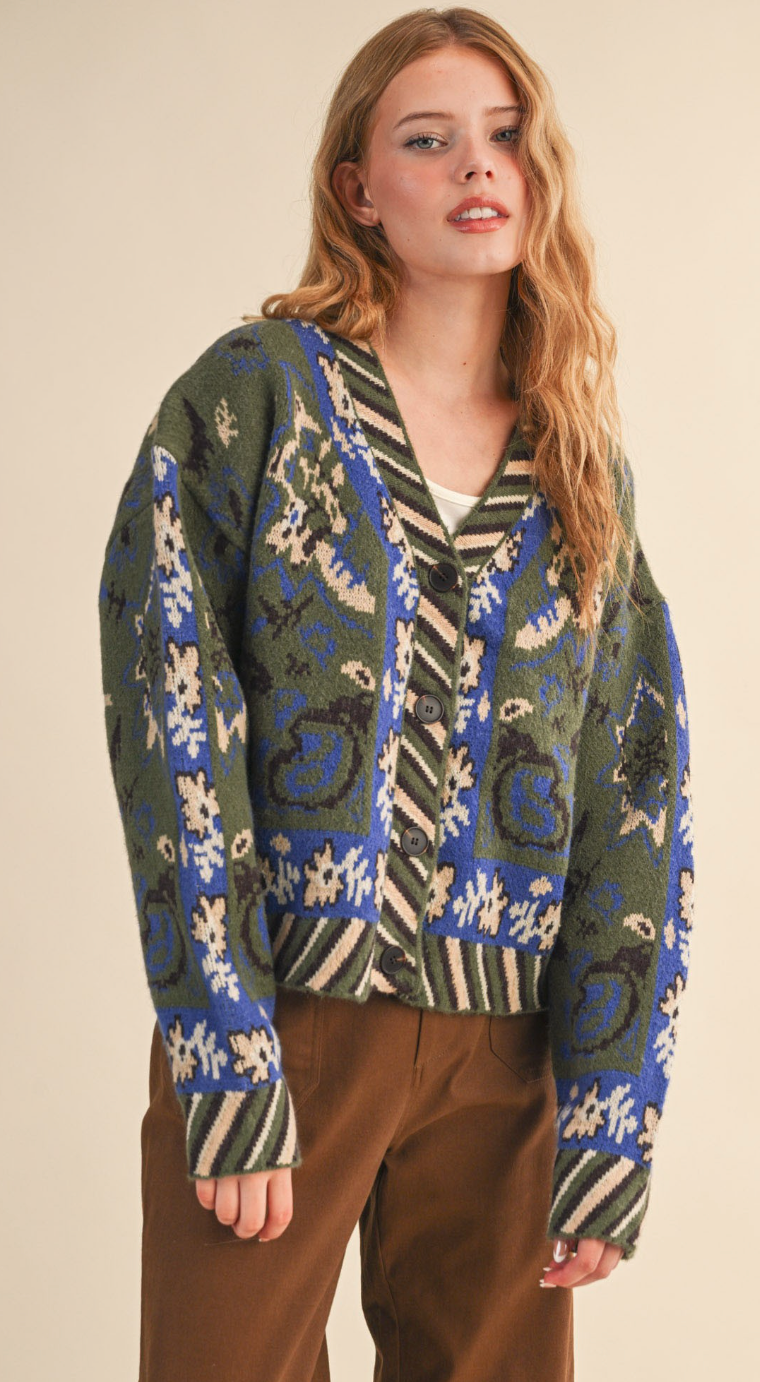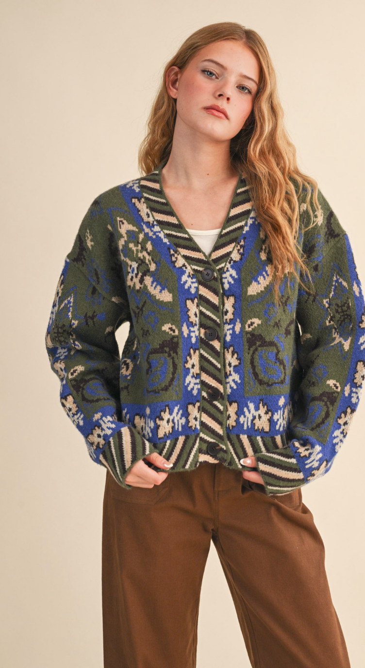 Green, blue, brown and charcoal aztec printed cardigan. Boxy fit, functional front buttons and cotton.