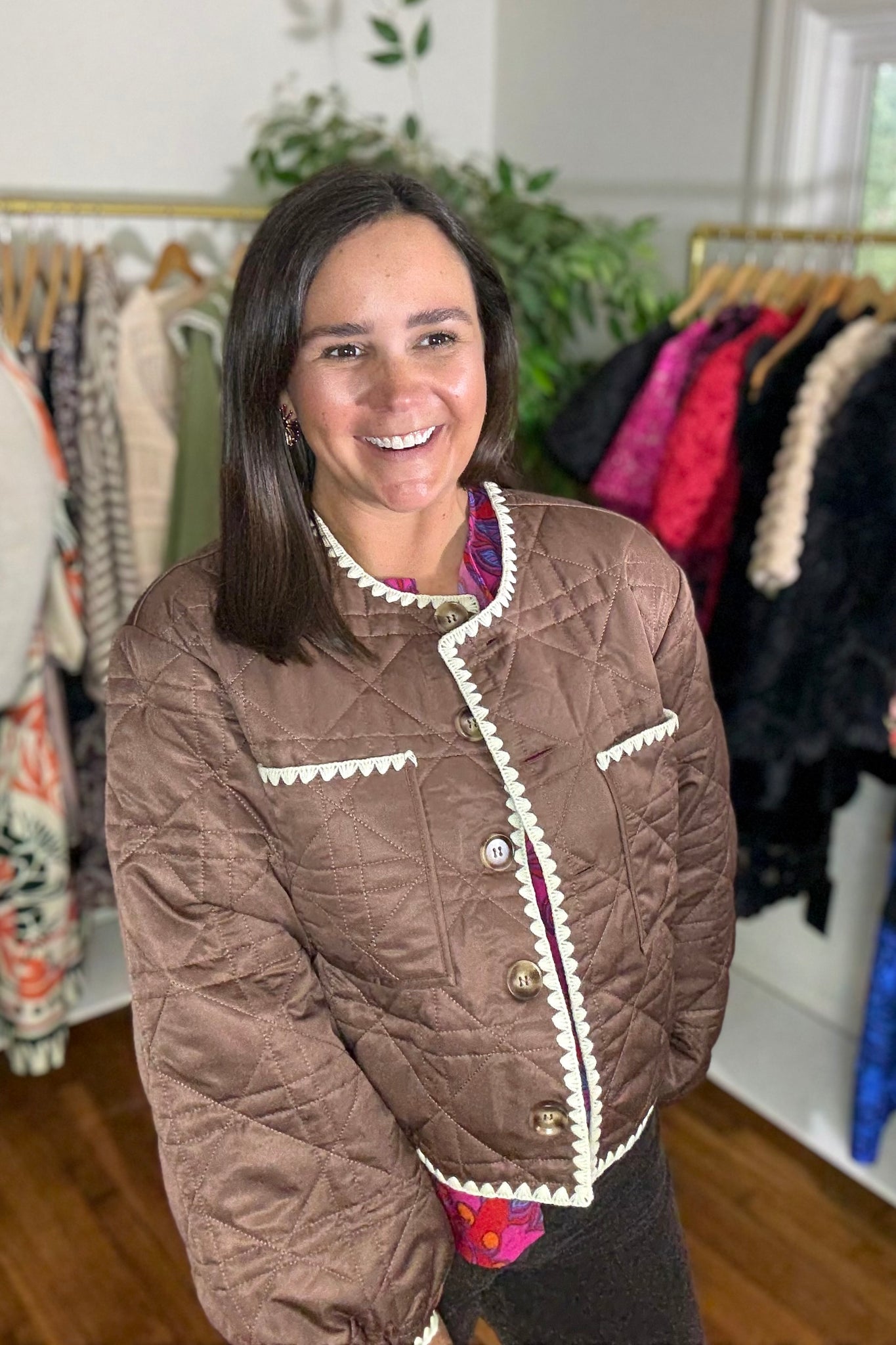 Brown quilted cropped jacket with crochet trim detailing and tortoise buttons. No collar, light weight.