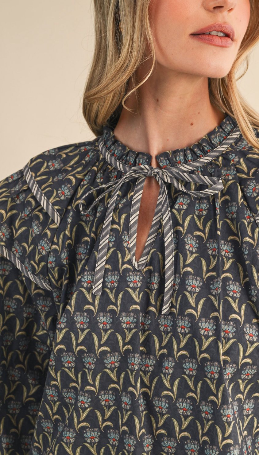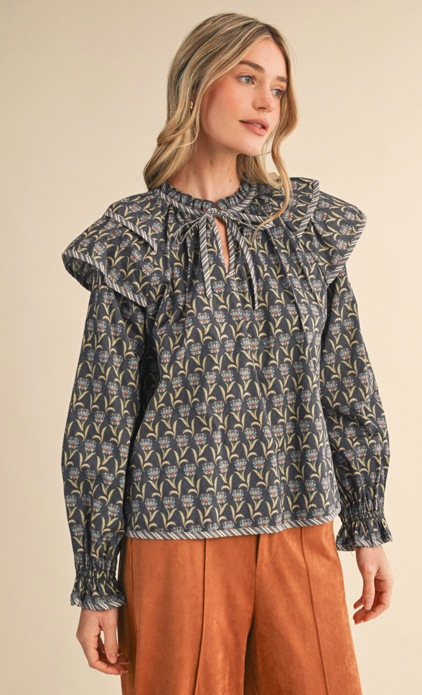 Ash black block printed cotton blouse. Long sleeves, double flutter shoulders, striped trim detailing and optional front tie closure. Cotton and lined.