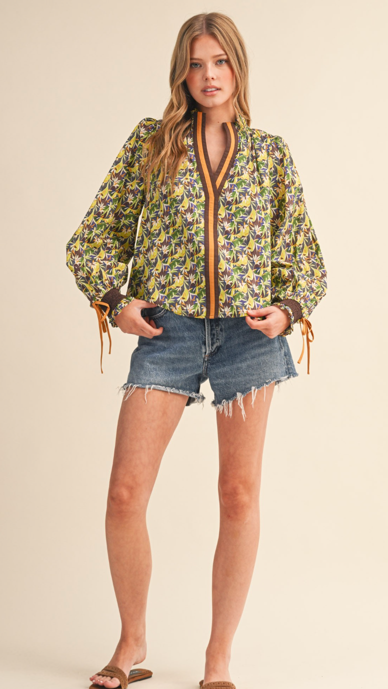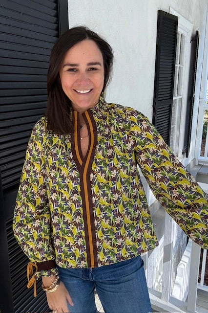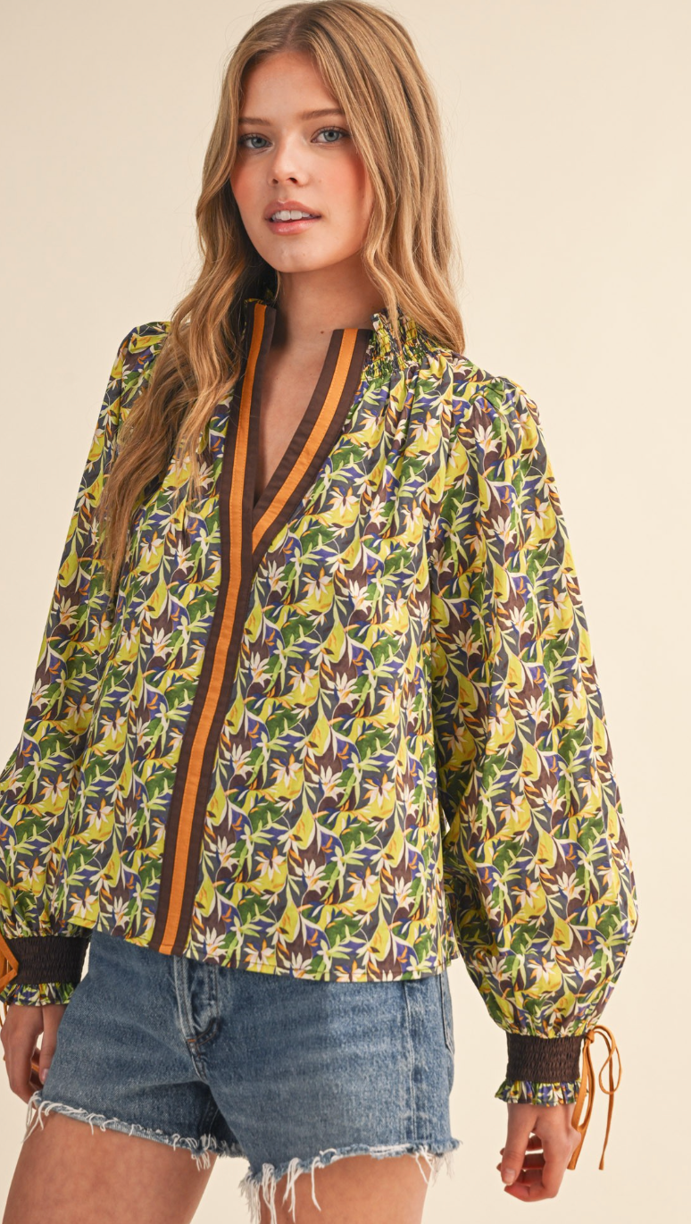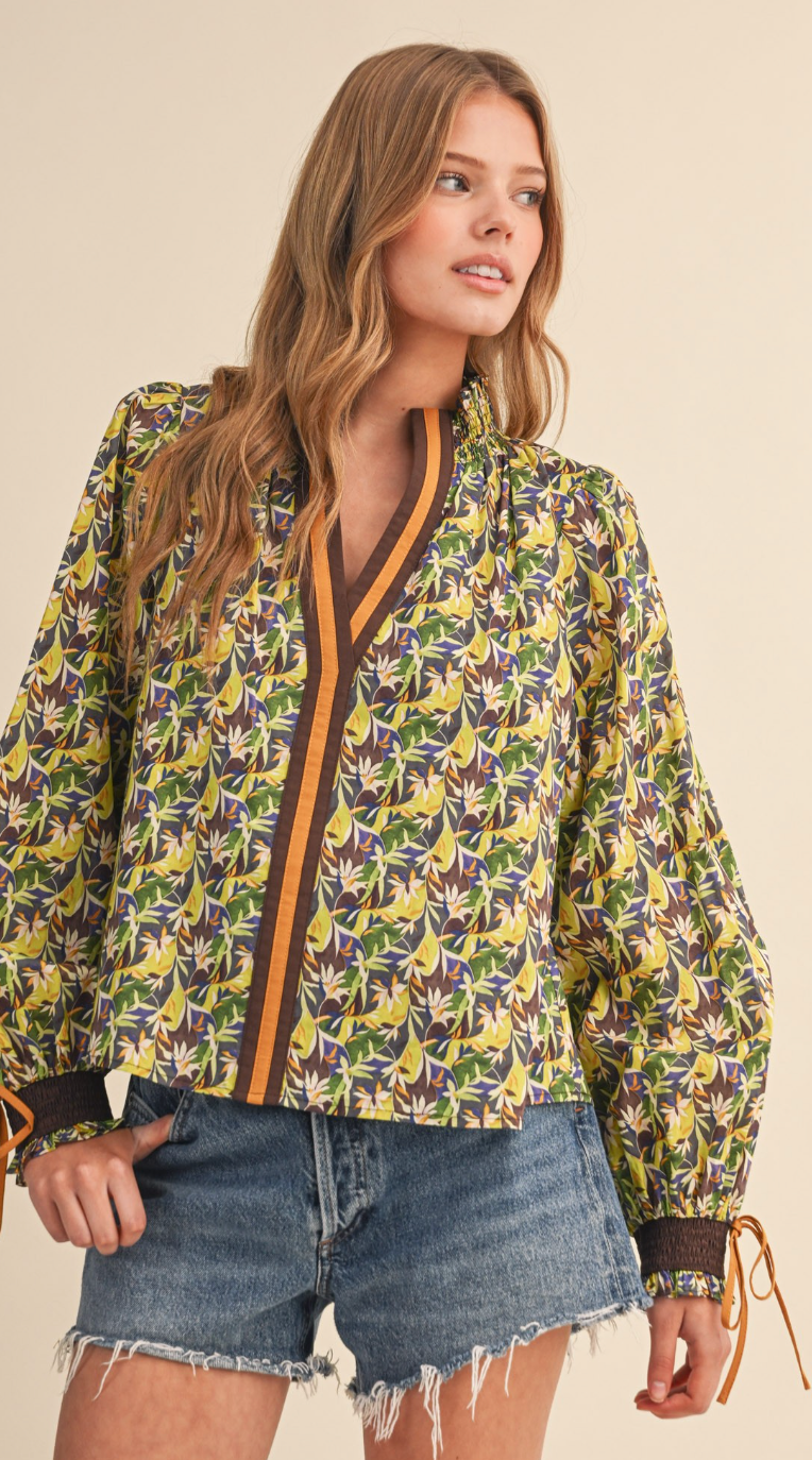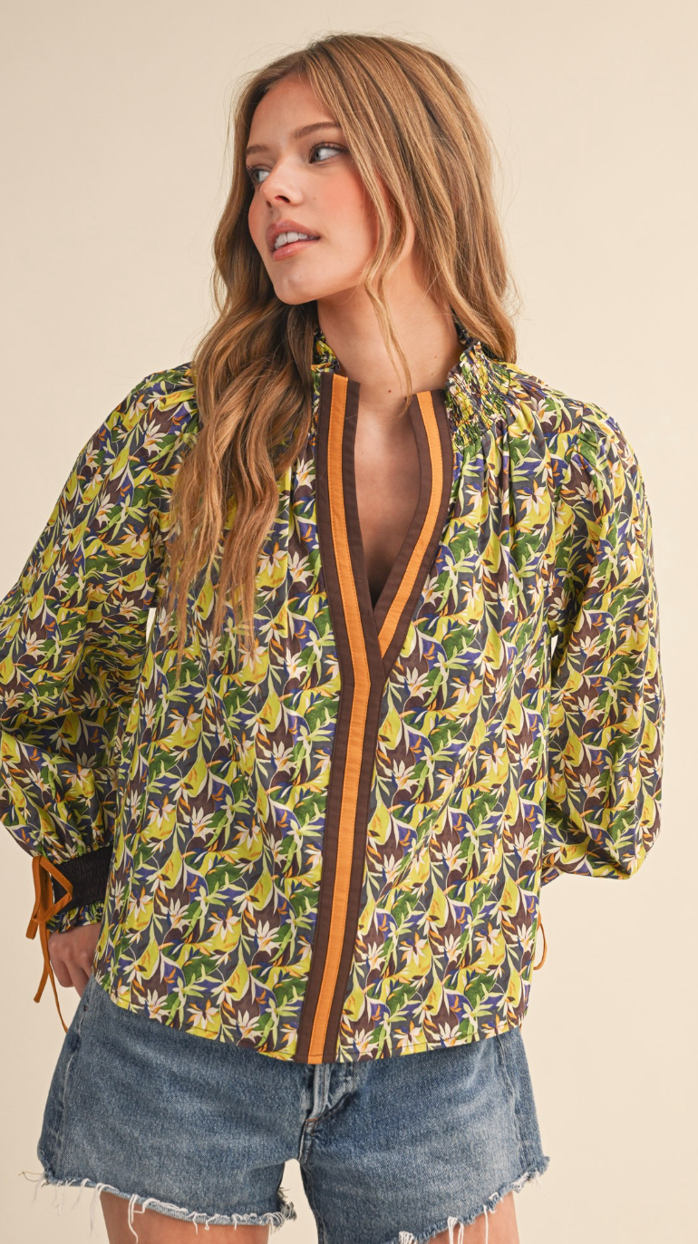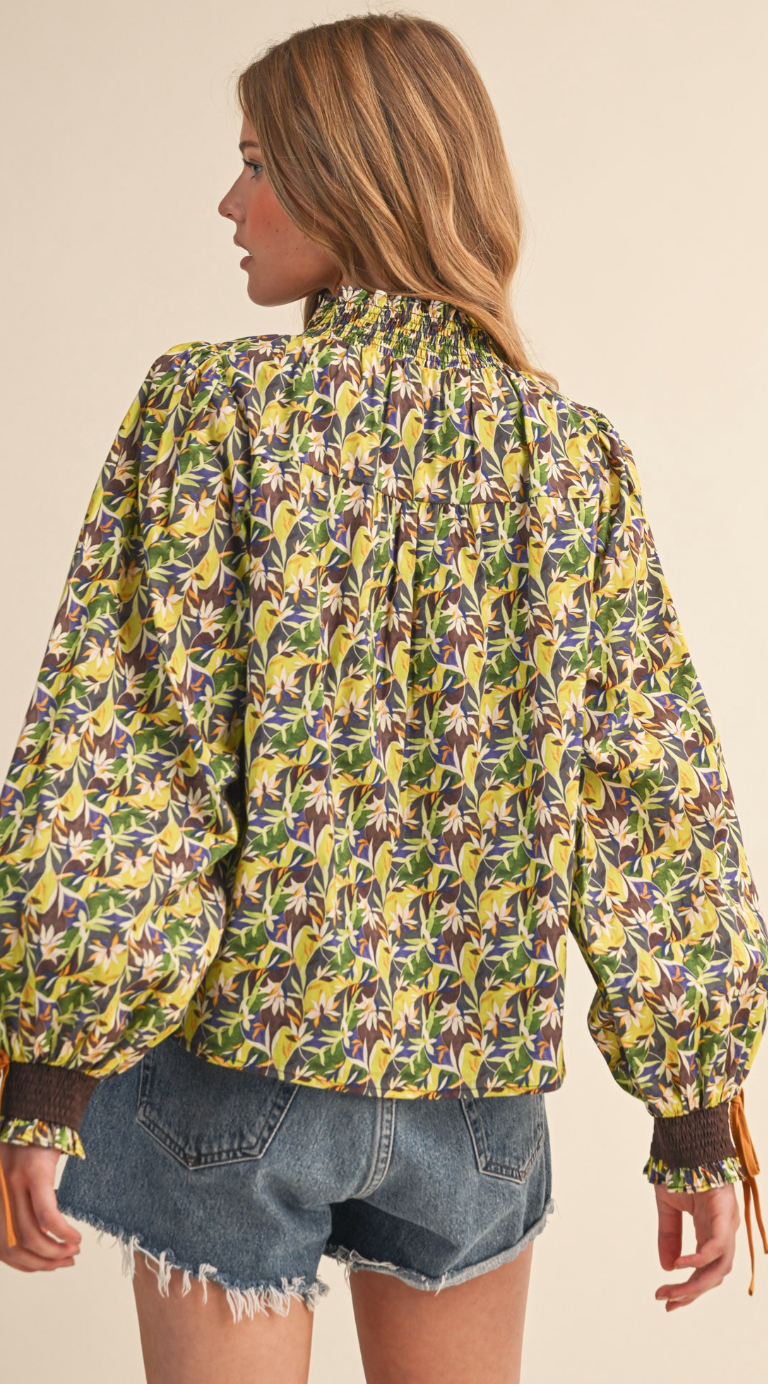 Green abstract floral pattern with contrasting front panel. Standing, smocked, ruffle collar. Smocked cuffs with ties.