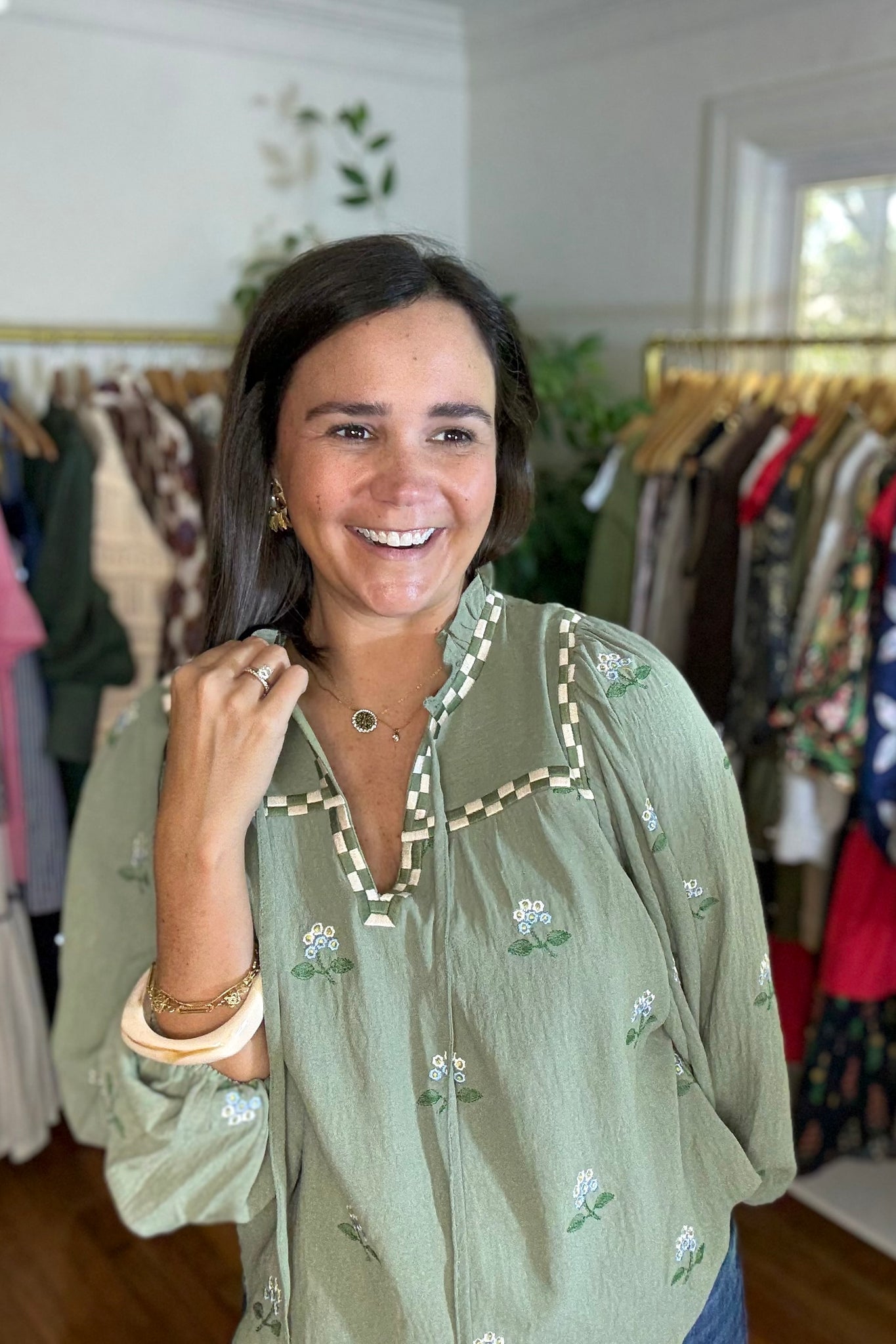 Olive blouse with embroidered flowers, striped piping detail on the front and backside of the yoke and ruffle standing collar with optional front tie closure. Long sleeves and flowy. Light weight cotton.