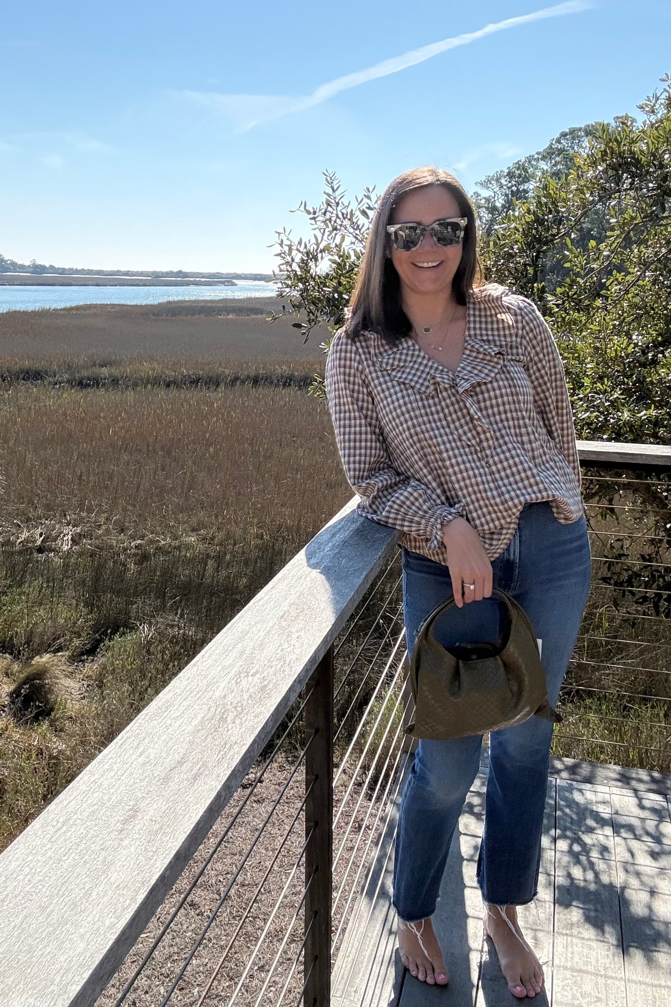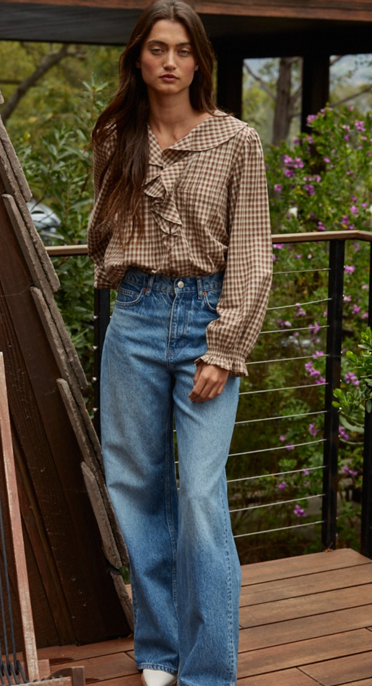 Woven Cotton Gingham Ruffled Plunged V-Neck Long Sleeve Blouse Top With Pintuck Detail. Light weight cotton.