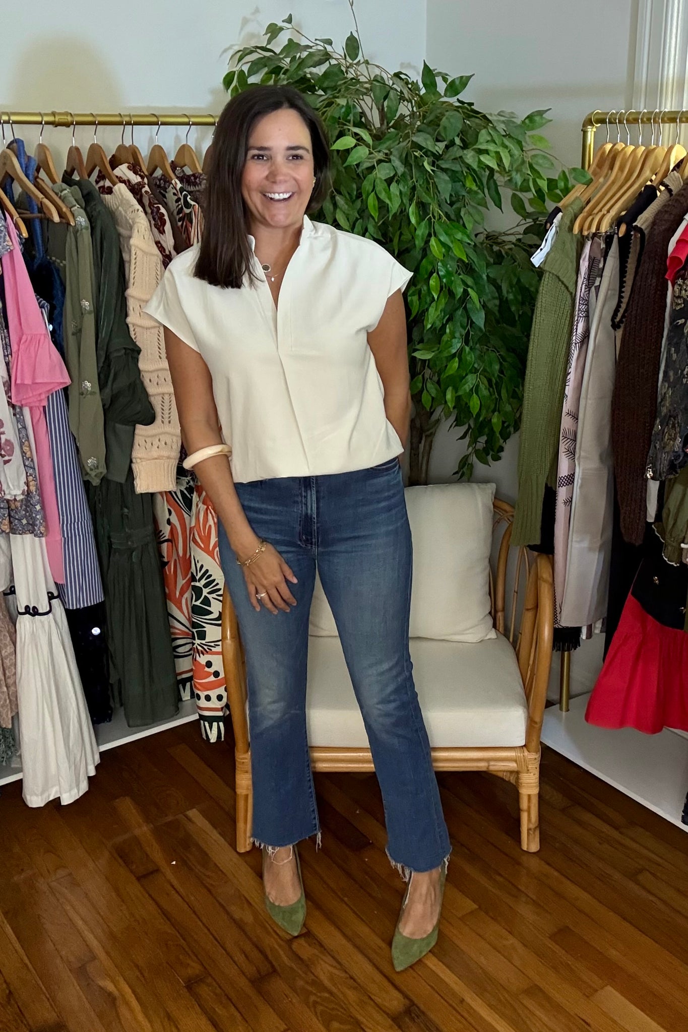 Ivory suede blouse with mock collar and cap sleeves. Split neckline to a pleat finish. Rounded hemline.