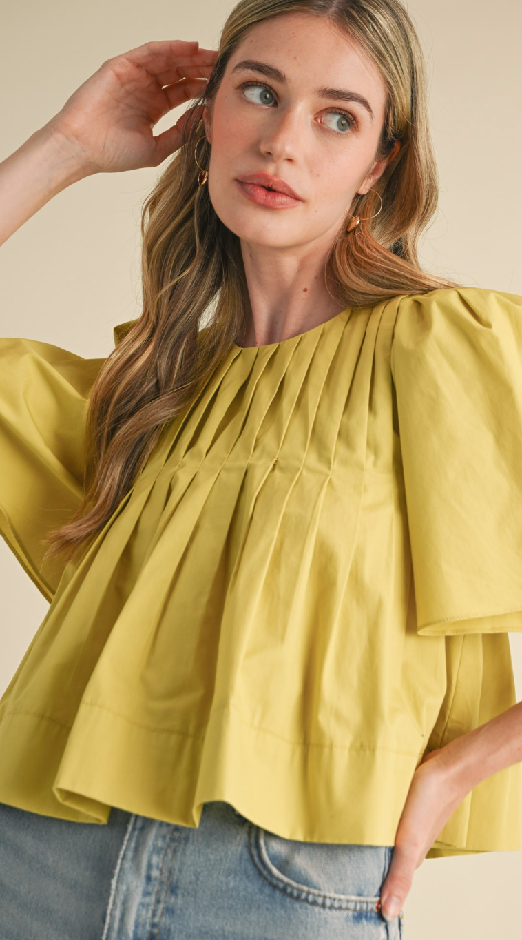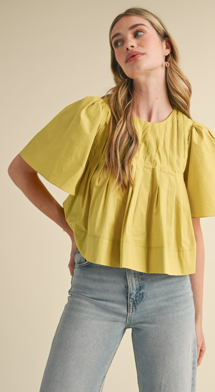 Lime chartreuse pleated babydoll style blouse. Bell sleeves, back zipper closure. Slightly cropped, squared fit. Does not show stomach.