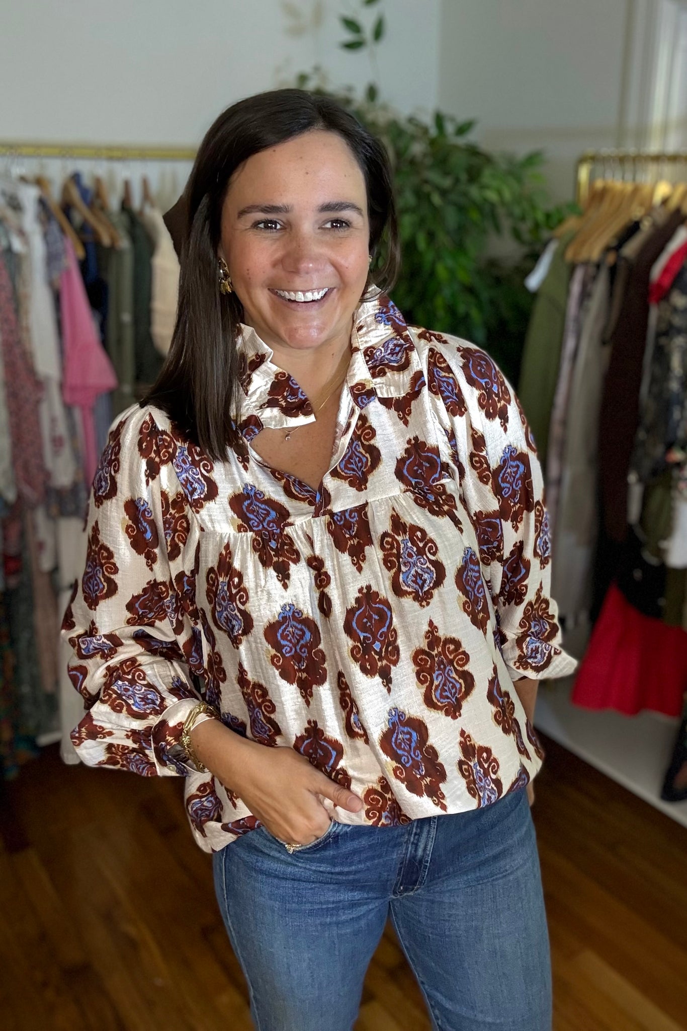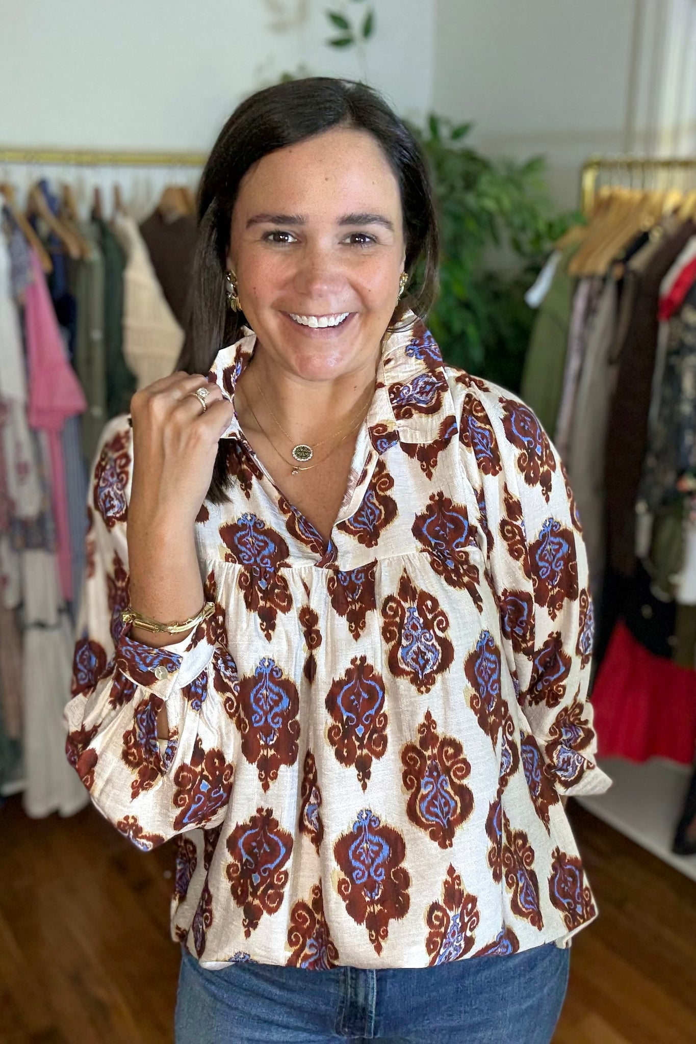 Brown and blue printed oversized blouse. Standing ruffle collar. Long sleeves and squared off yoke. Light weight cotton.
