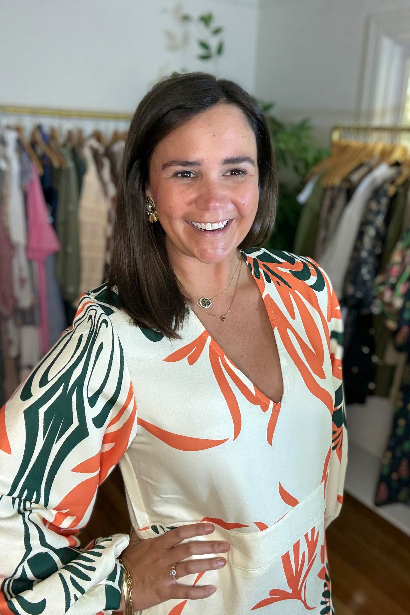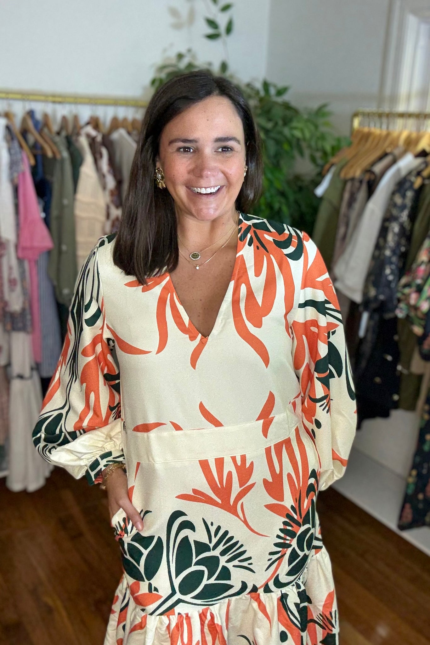 Orange and hunter green printed maxi dress. V-neck, three quarter length with an empire silhouette and drop waist skirt. Heavy knit poly blend.