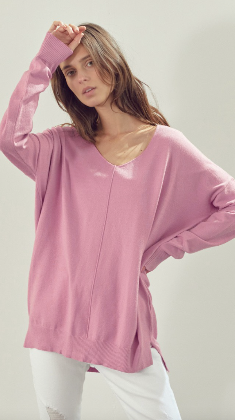 Heather gray, oversized, v-neck sweater. Covers front and backside with side slits, fits oversized. Cotton, extremely soft.