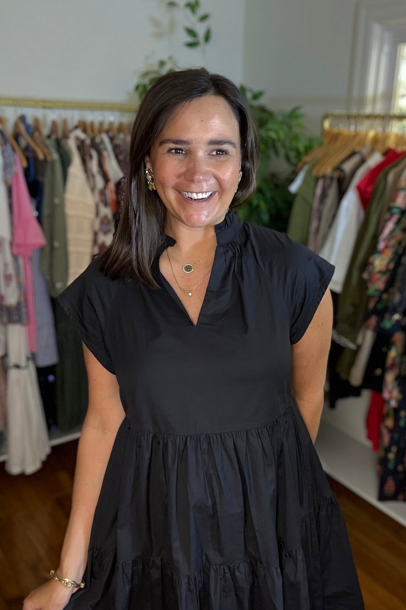 Janelly tiered mini dress. Flutter sleeves, ruffle detail on neckline and tiered skirt with pockets. Cotton poplin and lined.