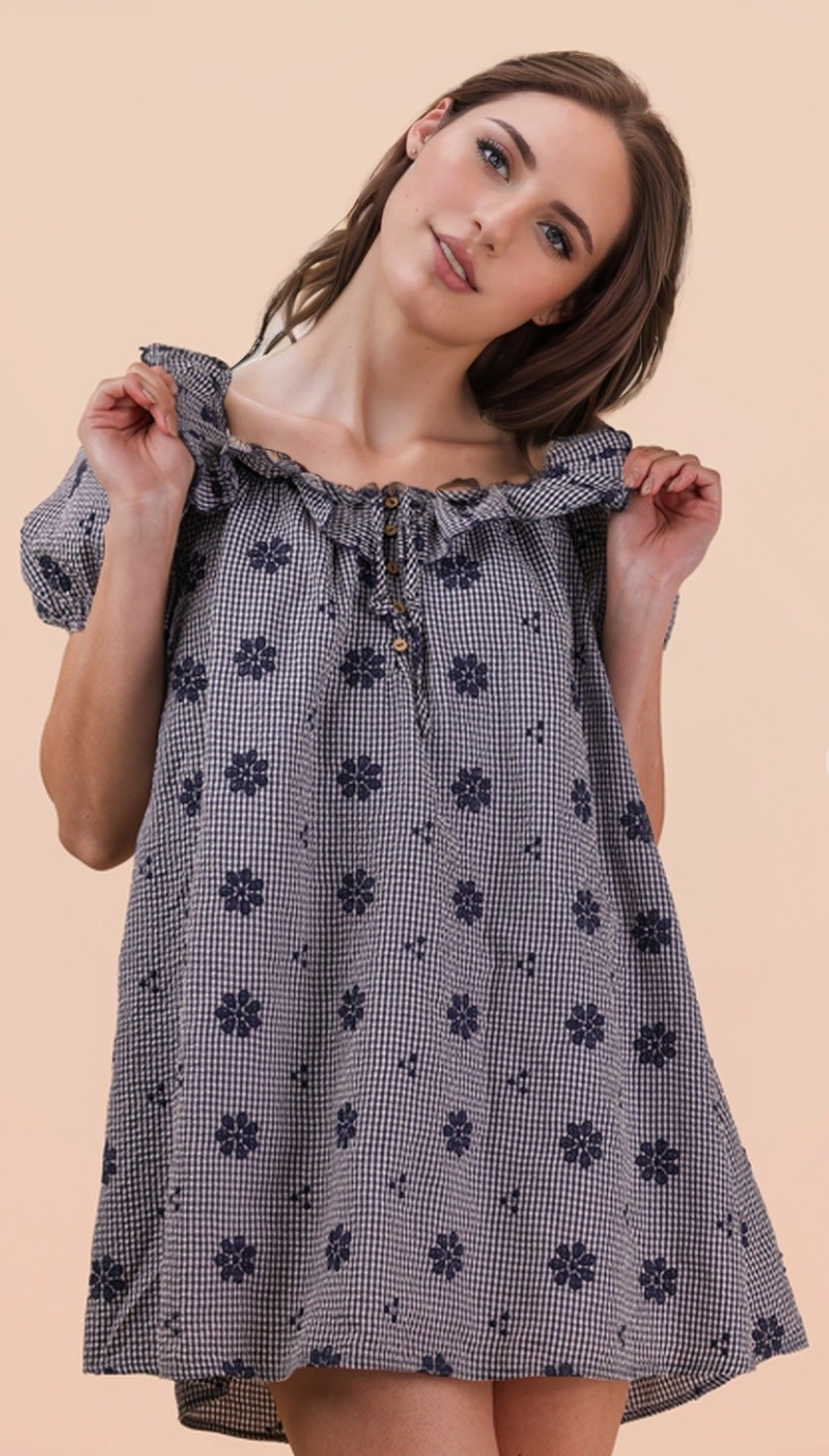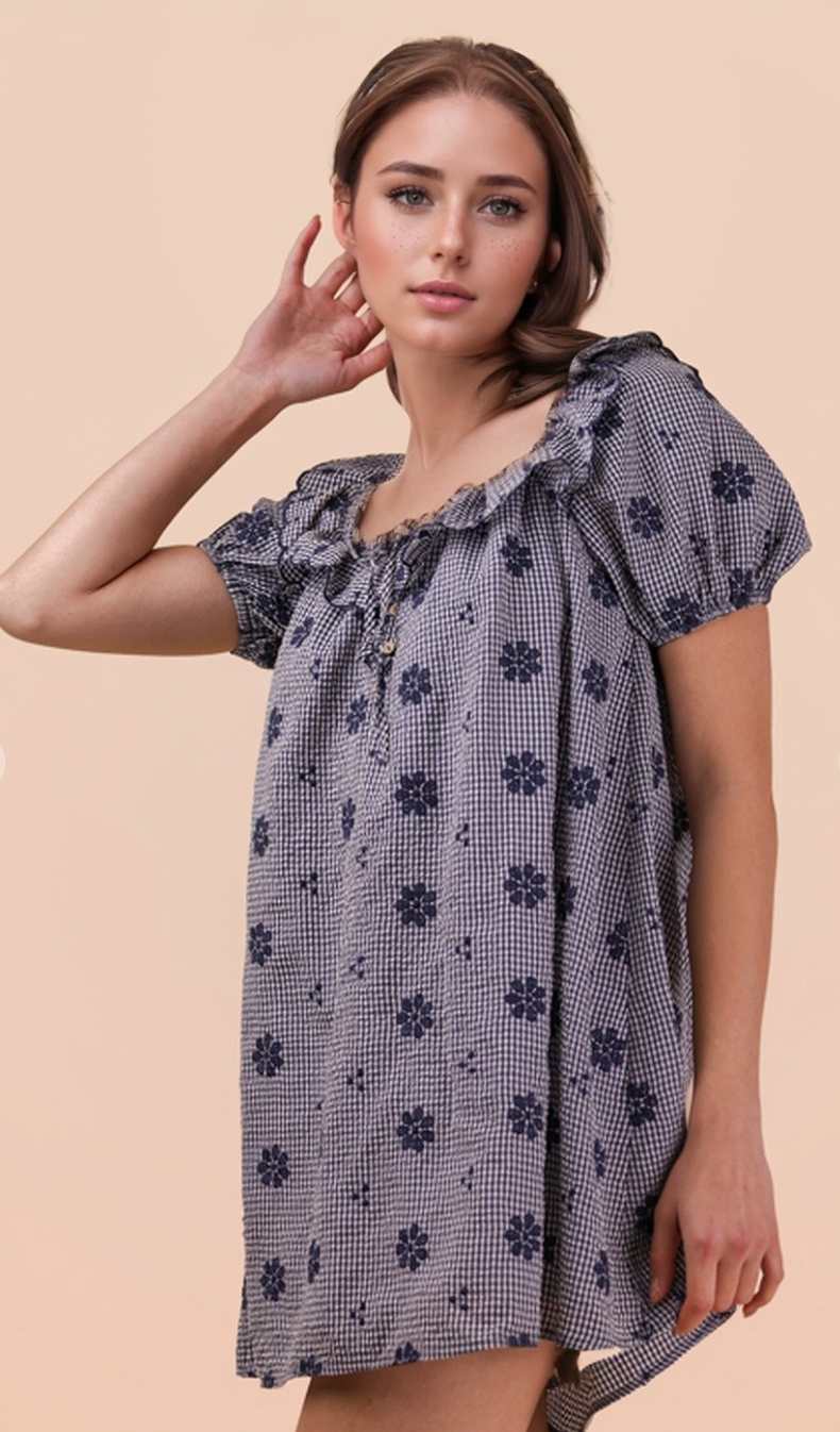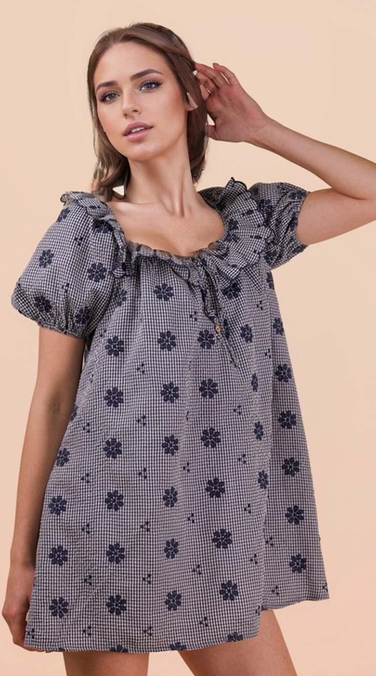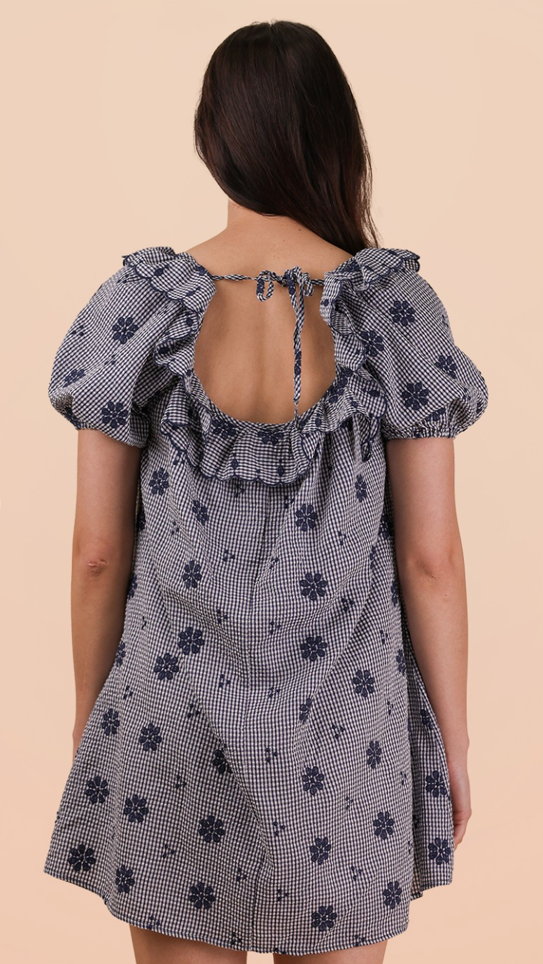 Navy and white gingham mini dress with ruffle neckline and back tie closure. Puff sleeves and babydoll shift. Cotton.